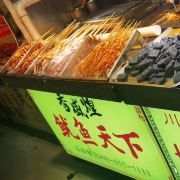 啦喜街不只是一条街,而是纵横交错的一组街,这里主要的小吃都集中在主干道明德路上,有烤鱿鱼、杂粮饼、碗仔糕、肉夹馍、寿司等美食。每到傍晚,成群的学生走出校园拥向这里,场景十分热闹。