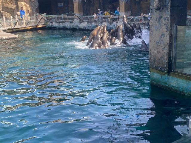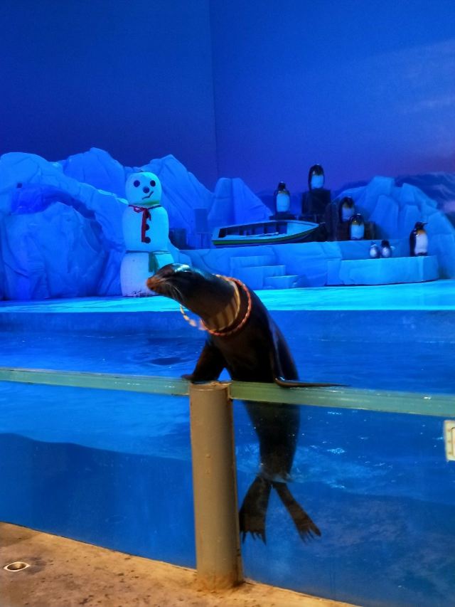 馆里的表演更是精彩,海狮和小丑的比赛太逗了,海狮顶球稳稳的,跳水动作堪比专业运动员。还有海豚和虎鲸的表演,聪明可爱极了。而且场馆环境干净,指示牌清楚。带孩子来能增长知识,情侣来也浪漫。总之,这地方值得一去,来了就不会后悔!