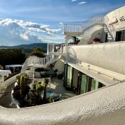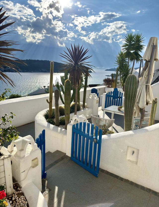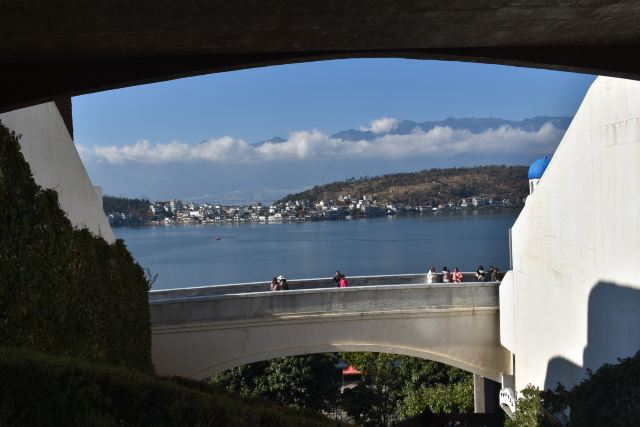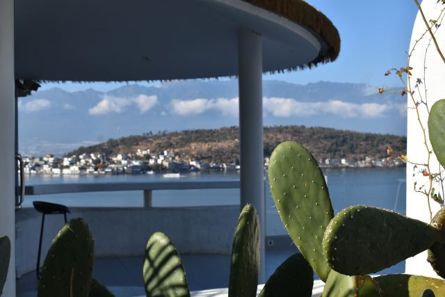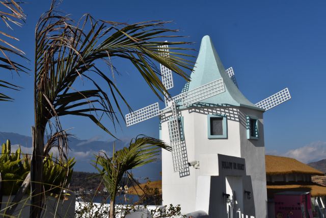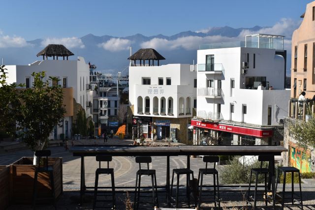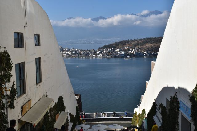 不得不说这位投资商和设计师确实是个天才,把“理想邦”建在了洱海边上的一座山上,一条条弯弯曲曲的小巷、一层层不规则的白色小房子,漫无边际地延伸向山顶,蓝色的门窗、泳池、露台点缀其间,创造出了大理自己的“圣托里尼”。