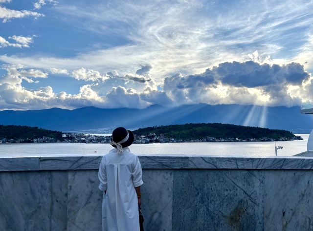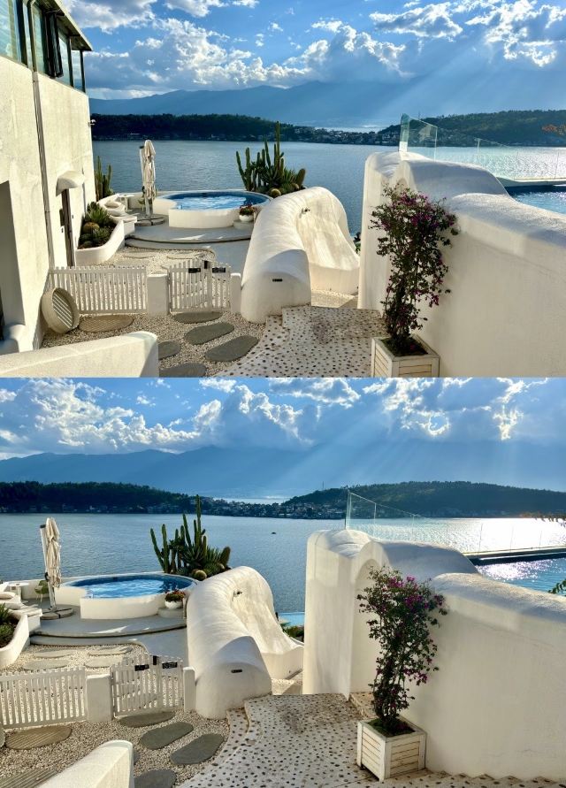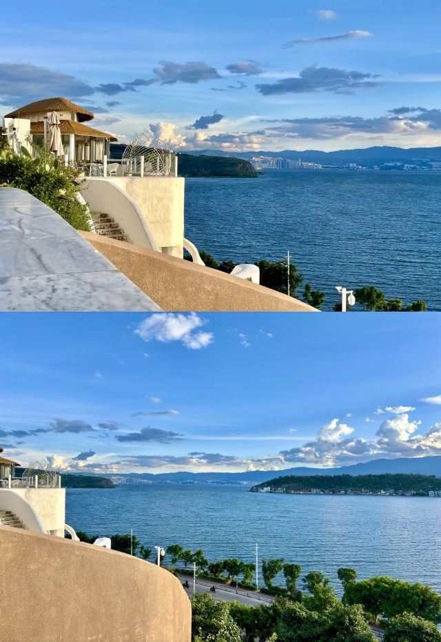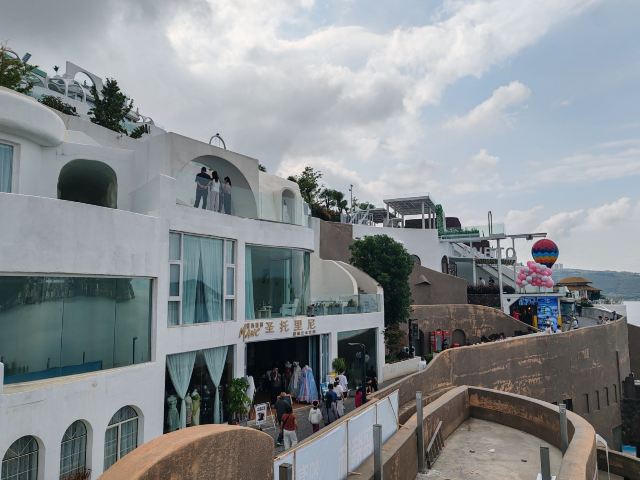 5分 超棒洱海边一网红打卡地,远远看去,白的建筑蓝的湖水,它还有一个各字“圣托里尼”,原本是希腊爱琴海上的火山环岛,显然这个景区是以模仿该岛的,应该说,挺有特色,以白色做主色调,蓝色为辅,水天之色