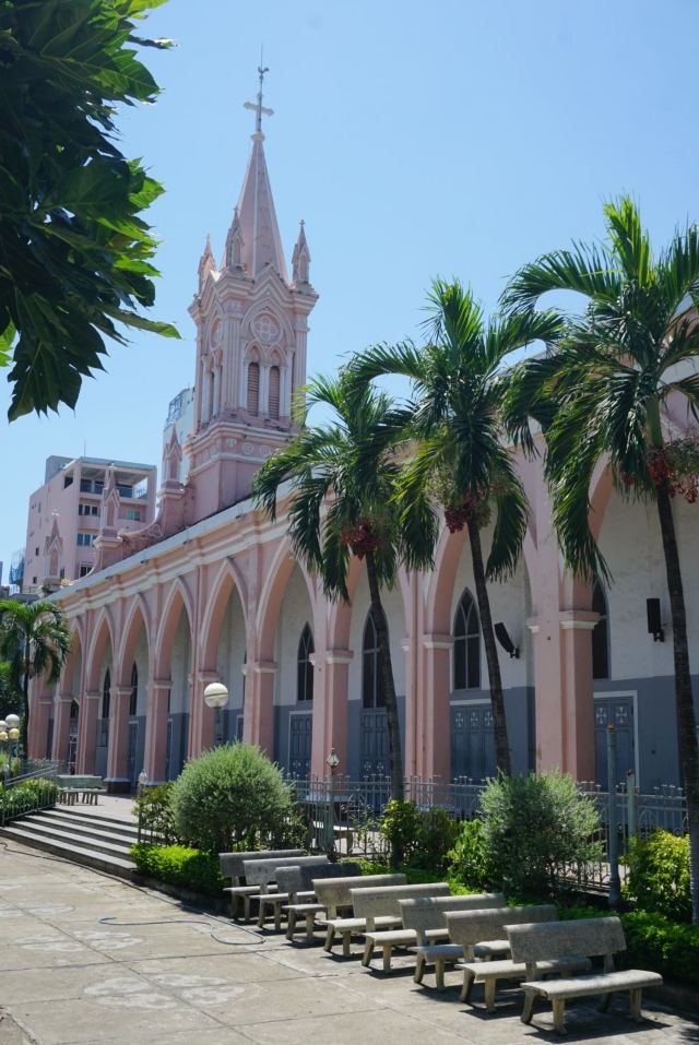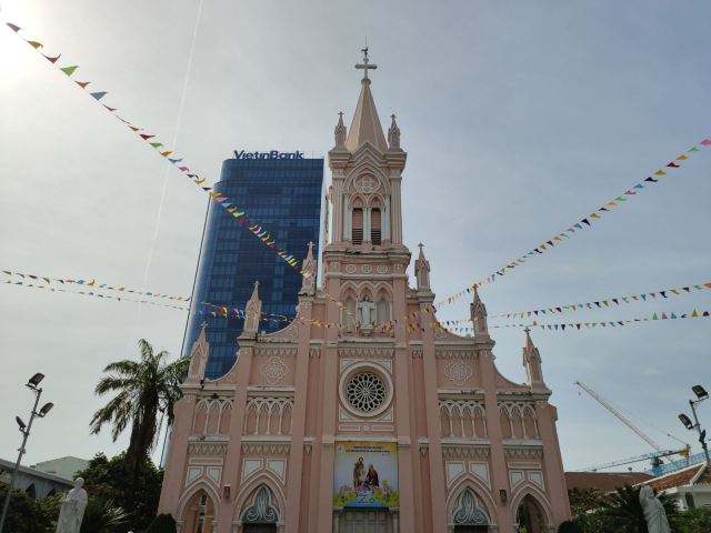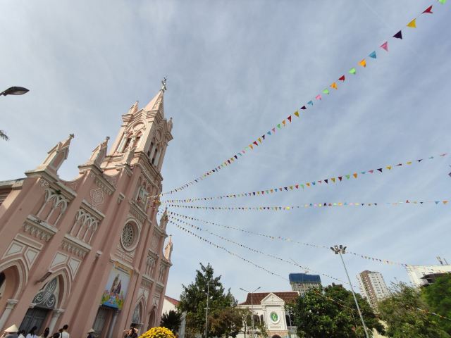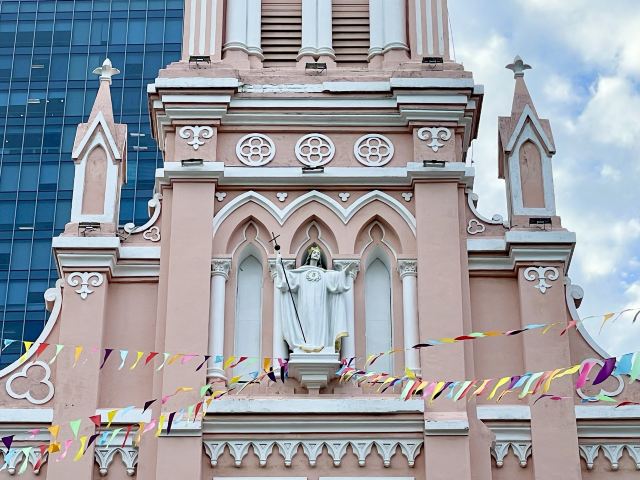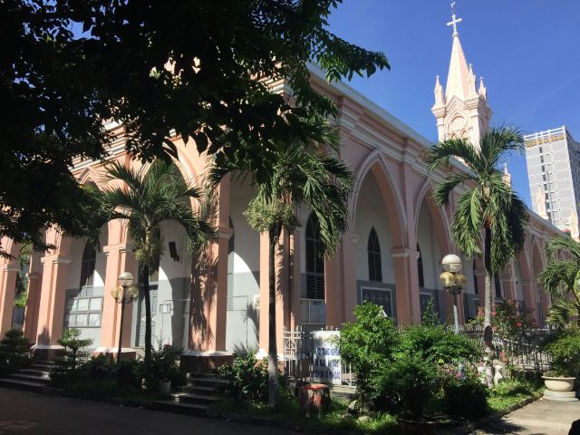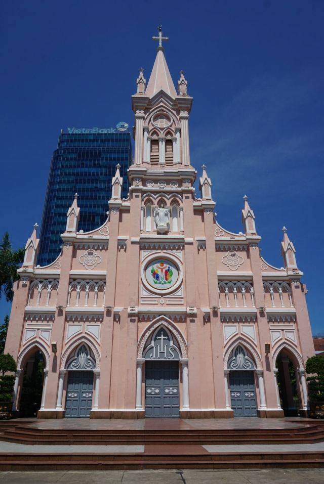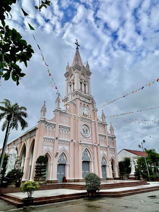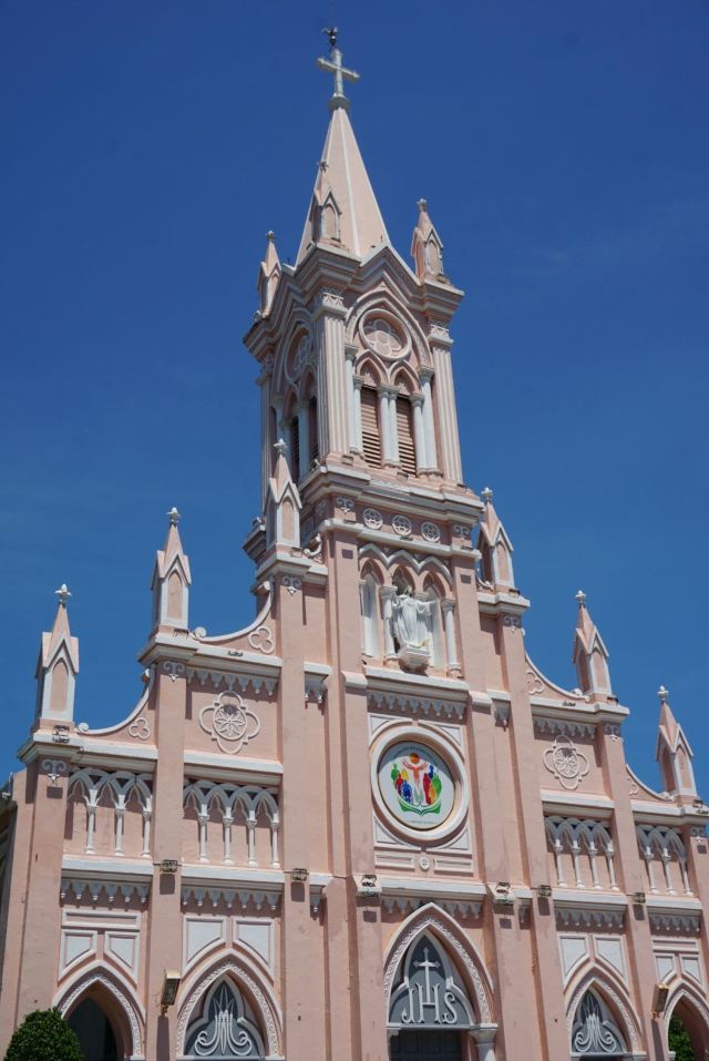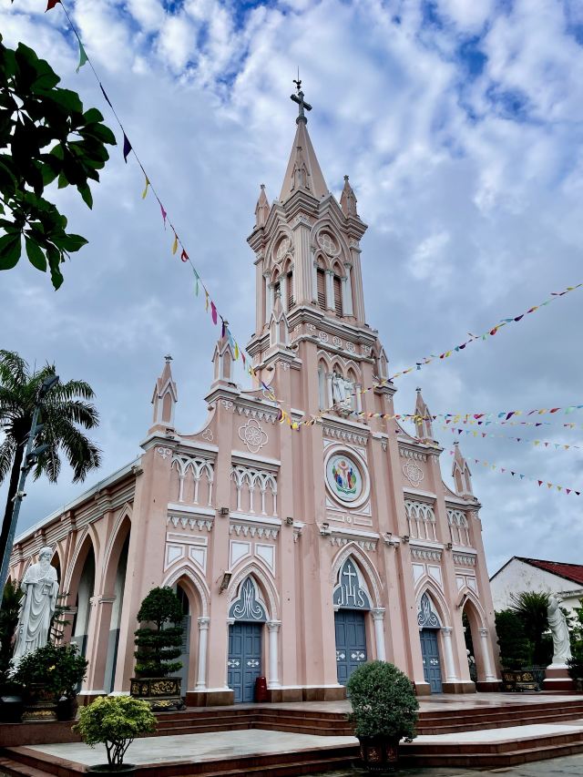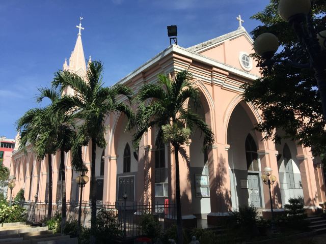 岘港主教座堂建于1923年,属于法国统治时期的天主教堂,以其高大钟塔上的风向标为标志,是越南中部较大的教堂。中世纪风格的彩绘大玻璃窗与粉红色的外观相映成趣,鲜明可爱。周日有弥撒。