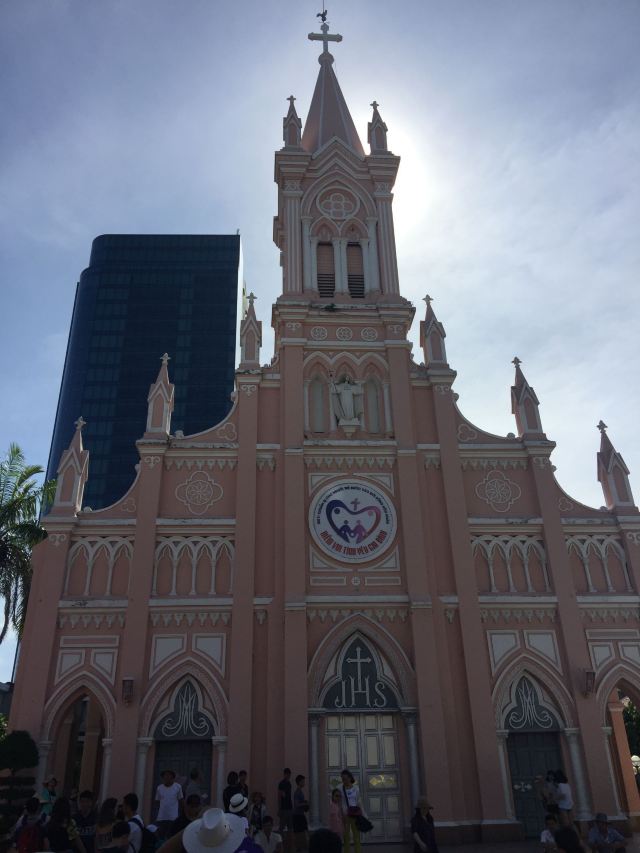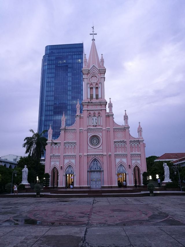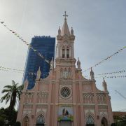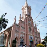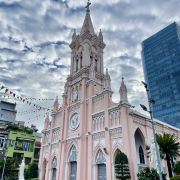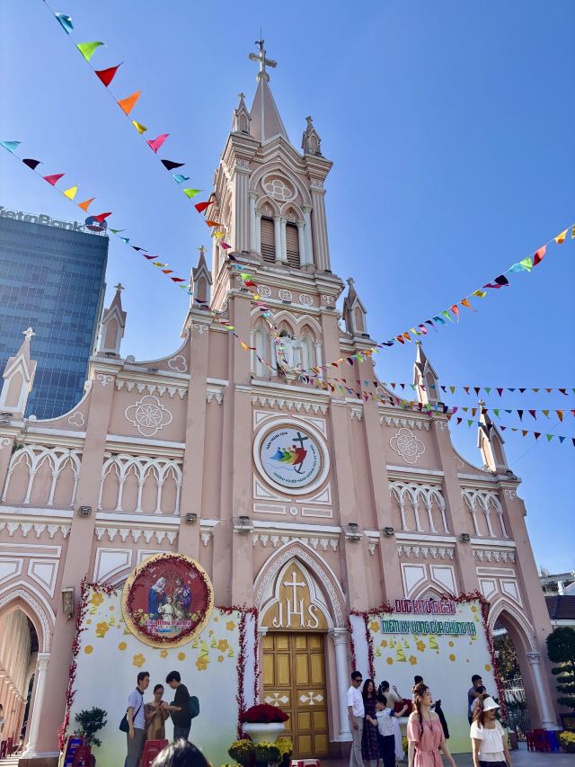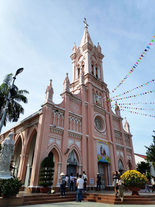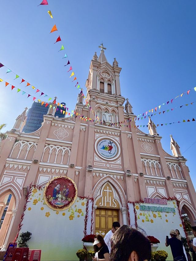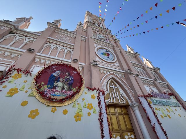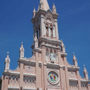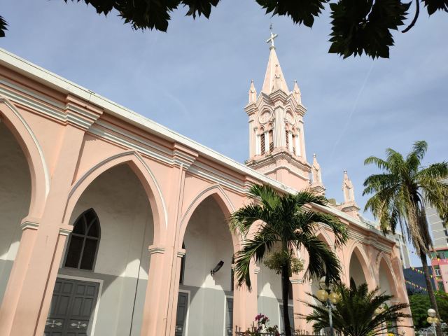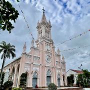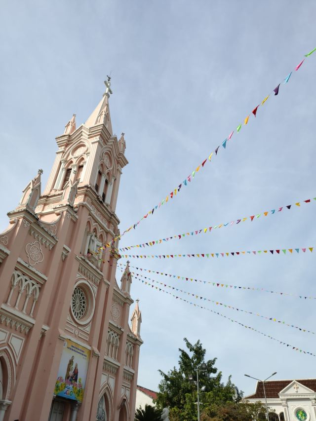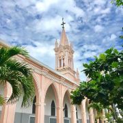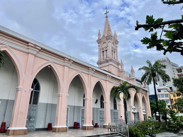 岘港主教座堂建于1923年,属于法国统治时期的天主教堂,以其高大钟塔上的风向标为标志,是越南中部较大的教堂。中世纪风格的彩绘大玻璃窗与粉红色的外观相映成趣,鲜明可爱。周日有弥撒。