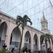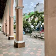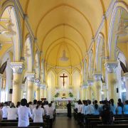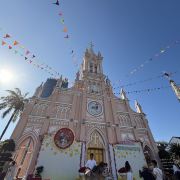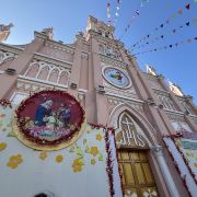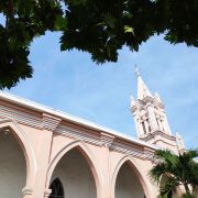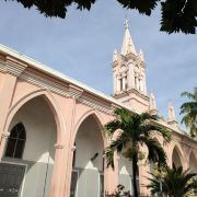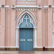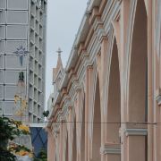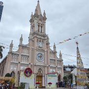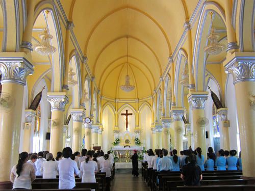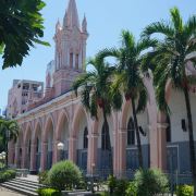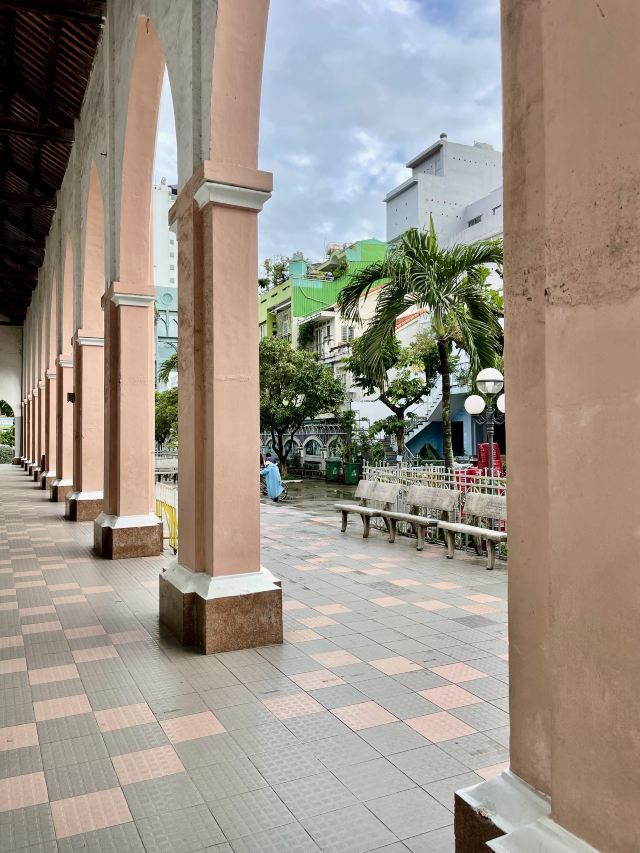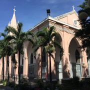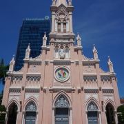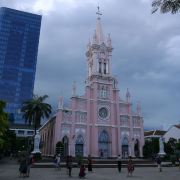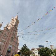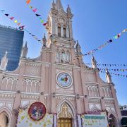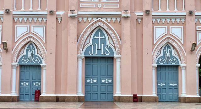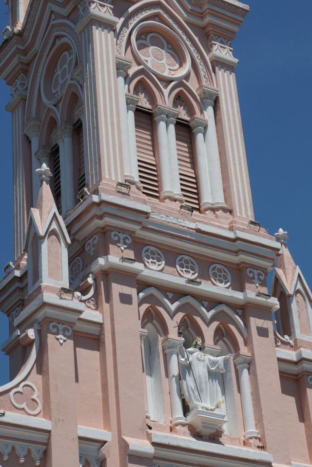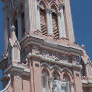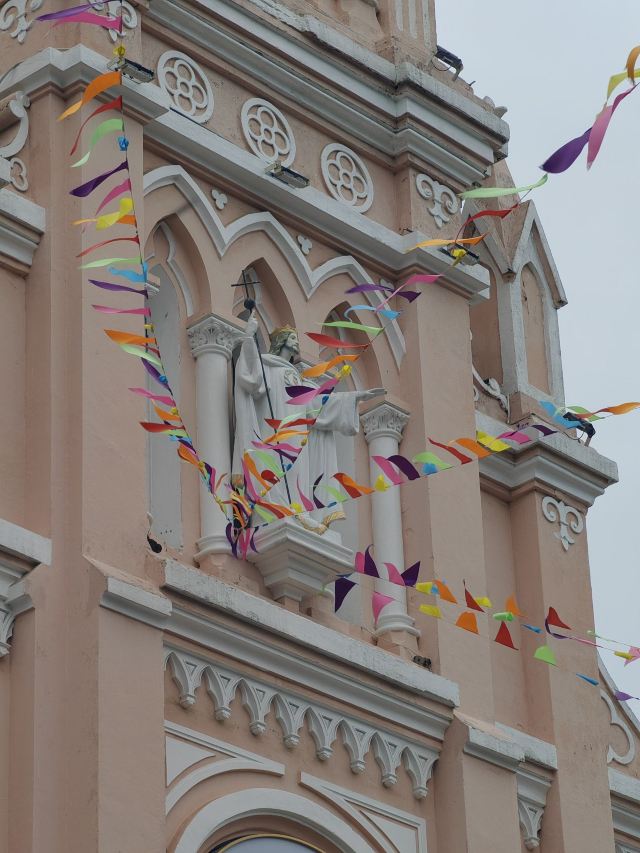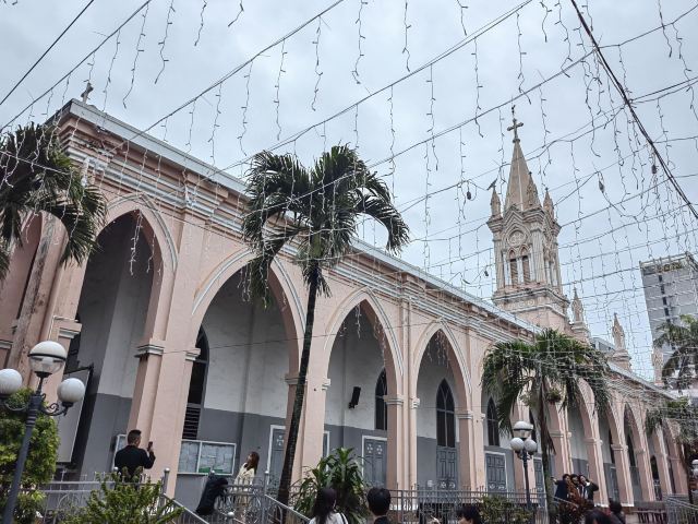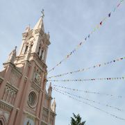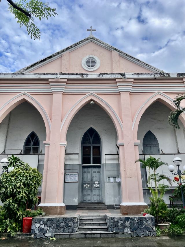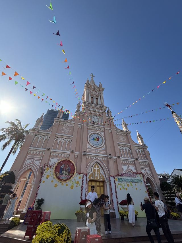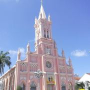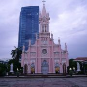 岘港主教座堂建于1923年,属于法国统治时期的天主教堂,以其高大钟塔上的风向标为标志,是越南中部较大的教堂。中世纪风格的彩绘大玻璃窗与粉红色的外观相映成趣,鲜明可爱。周日有弥撒。