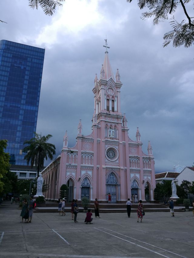 4分 满意岘港大教堂,是岘港的主教堂,外观是粉红色的,所以又叫粉红教堂,比起胡志明市的粉红教堂,岘港的粉红教堂比较浅色一点,从正面看,会看到背面的越南银行玻璃大楼,需要迁就一下角度才不会拍到,这里的游客也是挺多的。