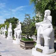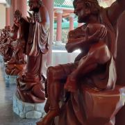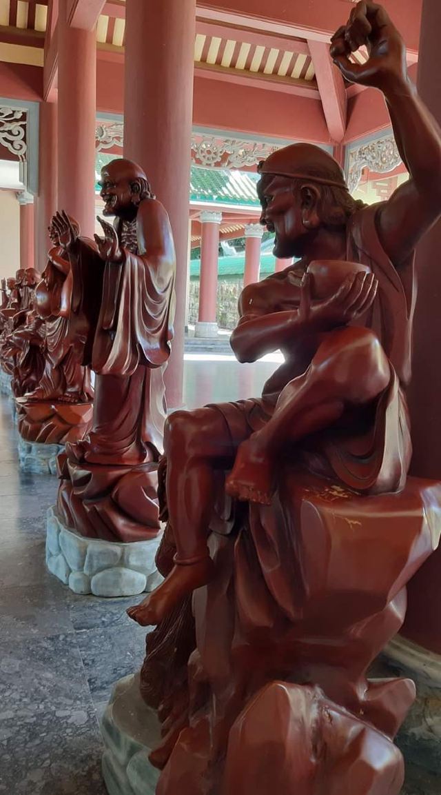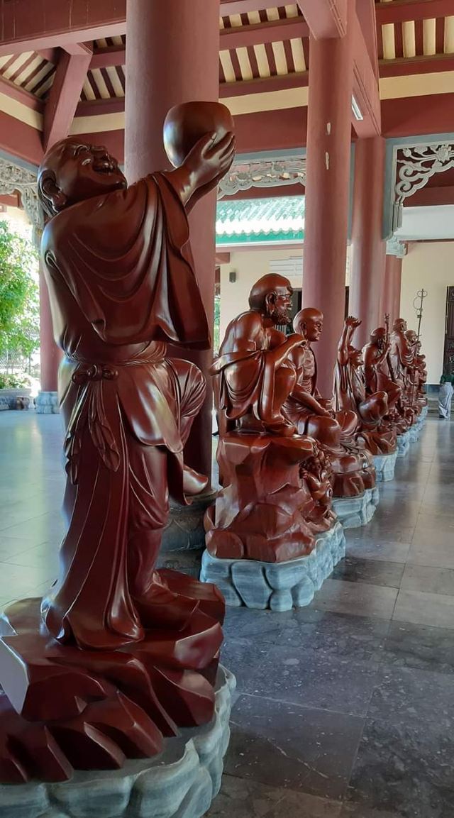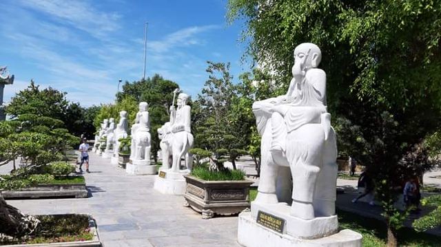 寺庙的两旁都是以大理石做成的姿态各异的罗汉摆设。由于五行山灵应寺是由在越南的华人建造的,所以可以看到寺院内各殿的楹联几乎都是汉字。