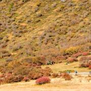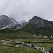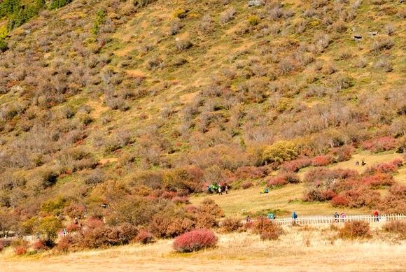 5分 超棒这是一片位于群山环抱间的高海拔草场,去的时候正是秋季,牧草泛黄,但风光依然美丽,游客如果要去五色海、牛奶海,也是在这里换乘马匹。