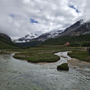 绿色的小溪,金黄的草地加上远处洁白的雪山,在荒凉的冬季也能见到如此的美景,感谢太阳公公今天赏脸。