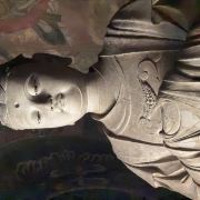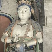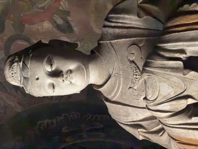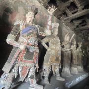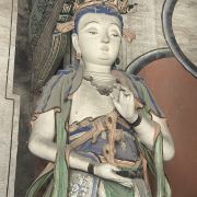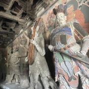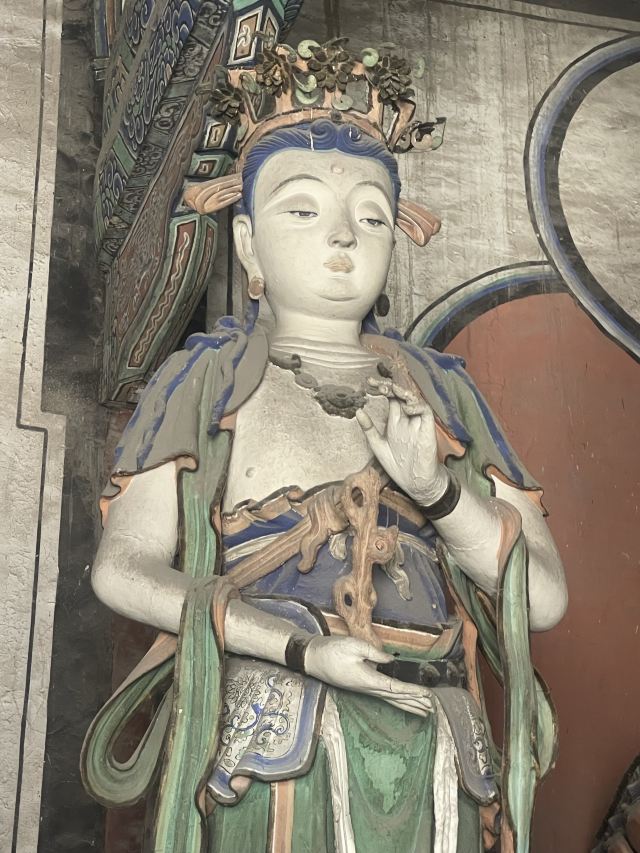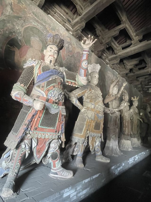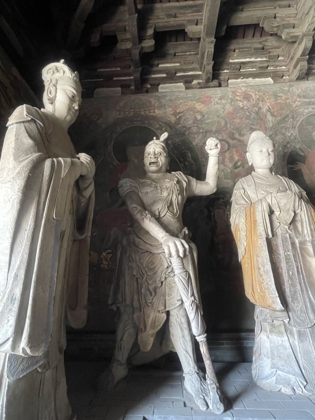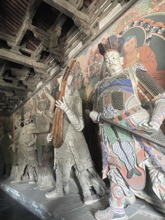 寺内的大雄宝殿,是善化寺规模较大的殿宇,建于辽代,金代重修。来到殿内,正面供奉有“五方佛像”,从西到东的排列是:北方不空成就佛、西方阿弥陀佛、中部毗卢遮那佛、南方宝生佛和东方阿閦佛。五方佛是佛教“密宗”崇奉的一组尊神。殿内两侧的砖台上还站立着二十四诸天塑像,这些塑像都是金代塑像中的精品。这些人神合一的杰作,每尊都高约三米,有的披甲执仗,有的朝冠官袍,有的圆润、衣带飘荡,尊尊表情生动传神。在大殿墙上,还有清朝康熙年间所绘的壁画,壁画的内容都是佛经故事。