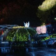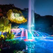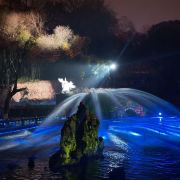灯光投映出碧绿的荷叶,微粉的荷花,一派夏日风情。随着《仙鹤缘起》故事的展开,黄鹤仙子于水上起舞,池中喷泉如花绽放,水幕与衣裙被灯光映照成梦幻的彩色。