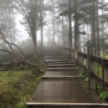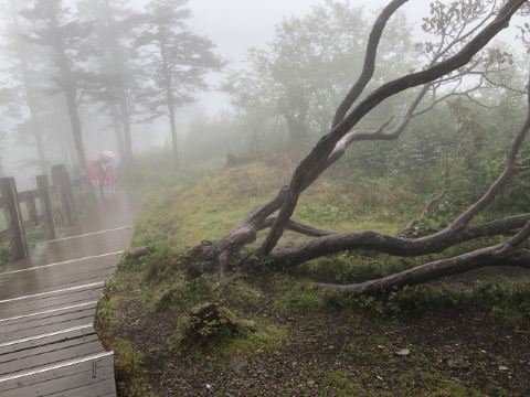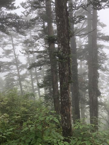 坪区周围遍布高大冷杉和杜鹃林,秋季层林尽染,冬季雾凇挂枝。附近的红石滩布满经地衣染色的赤色岩石,神秘而原始,极具地质美感。