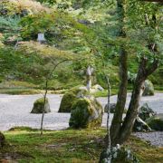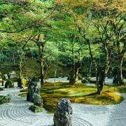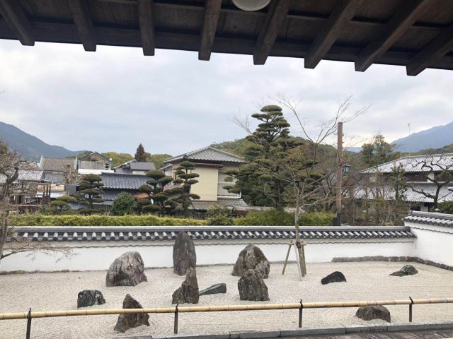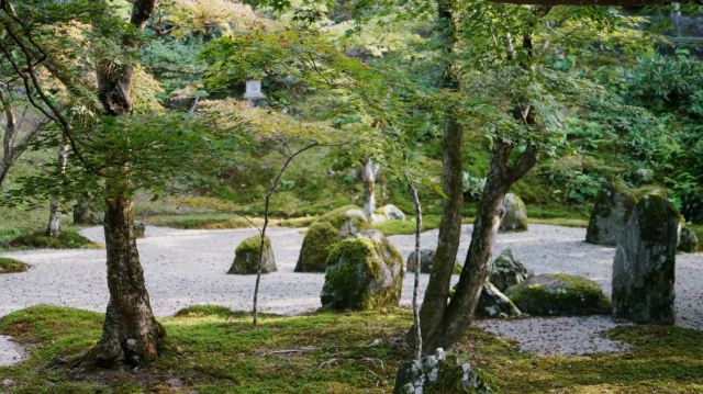 光明禅寺有两个日式花园。前庭”佛光石庭”是规模较小,用青苔演示陆地,白沙演示大海,用15块大小各异的岩石,以3、5、7块方式略排成“光”字。庭院深处的枯山水庭院有两棵红叶树,以石楠花和红叶而闻名,九州唯一呈现的“枯山水”也在此。花园里的青苔补丁,岩石和砾石布局成山光水色。适合在这里深度冥想。