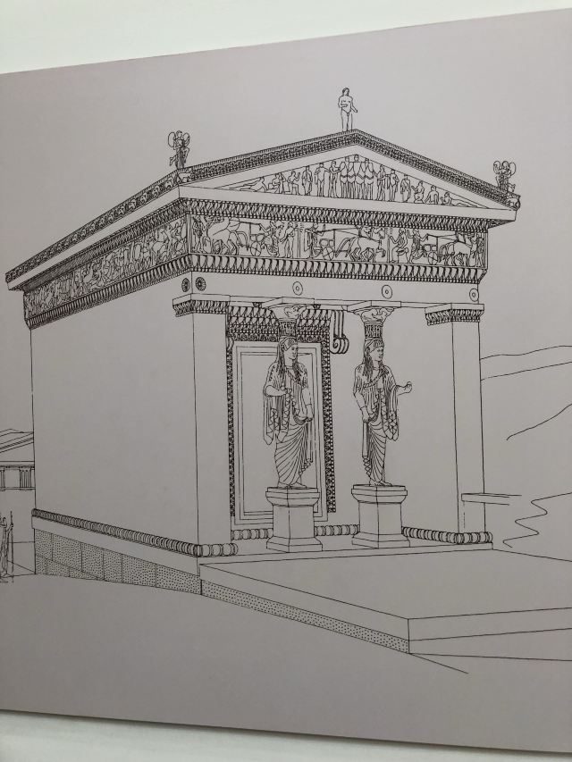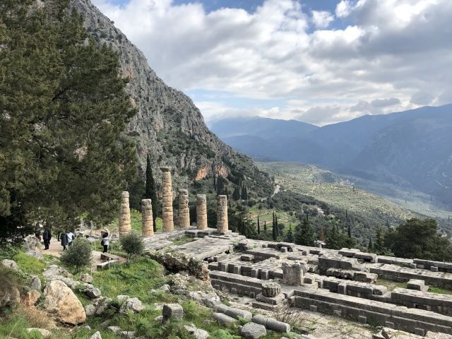 在遗址现场,阿波罗神殿只剩下7根长短不一的柱子,残柱碎瓦中,可见呈方形的神殿中心,以及沿山坡的Z形“圣路”。圣路两旁有马厩、礼物库和颂扬圣迹的纪念碑,然后是廊柱和祭坛,以及一个可容纳5000人的半圆形露天剧场及运动场。