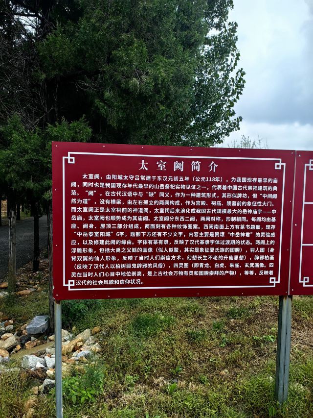 太室阙位于中岳庙天中阁南600余米处的中轴线上。是中岳庙前身太室祠的神道阙,始建于东汉安帝元初五年(公元118年),为当时的阳城长吕常所建,与少室阙、启母阙并称为中岳汉三阙。