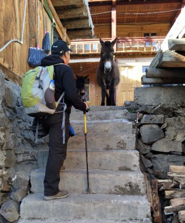 目前雨崩村还不通公路,要进去必须靠两条腿。从外界进雨崩村,需从西当开始徒步17公里,翻越3700米高的南宗垭口到达雨崩上村。翻垭口前这段上坡比较难走,如果体力不支,这一段也可以租骡子。路上有休息站可以买到泡面和水。过了垭口便是一段6公里的下坡,直达雨崩上村。