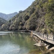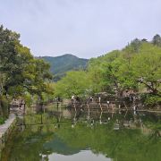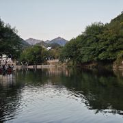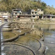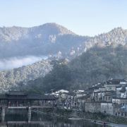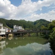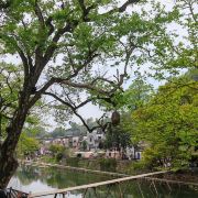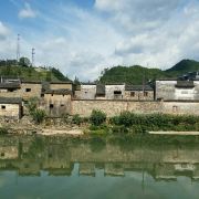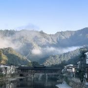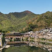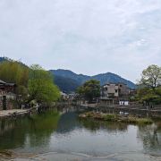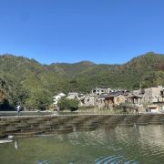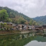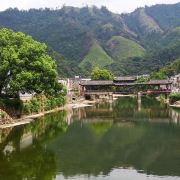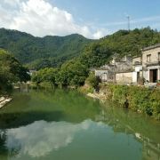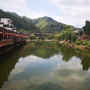 古镇在一个山坳里,瑶河静静穿过古镇中央,因此,游览古镇沿着河岸游走即可,瑶河左岸(吴氏祠堂这边)背倚一座翠竹郁郁的山峰,右岸是连延的青青山峰,瑶河上有多座桥梁方便两岸往来。