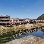 古镇坐落在山谷之中,四周群峰环抱,整个古镇南踞象山,北卧狮山,瑶河穿镇而过,形成山水萦绕的地理环境,让古镇更显宁静清澈。