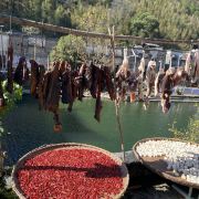 古镇里已有一定的旅游开发,有各式客栈民宿、宾馆,土产店、餐馆、杂货店。袋装小鱼干20元,碱水粑,笋衣30元/斤,冬笋干50~60元/斤,野生柿饼。镇口的木品店有很多木雕制品、木制品,一种木疙瘩中间被挖空磨光,可以做绿植或烟缸,可以做盘垫的樟树片。