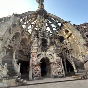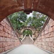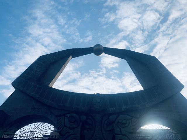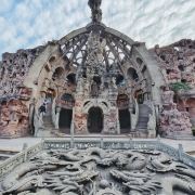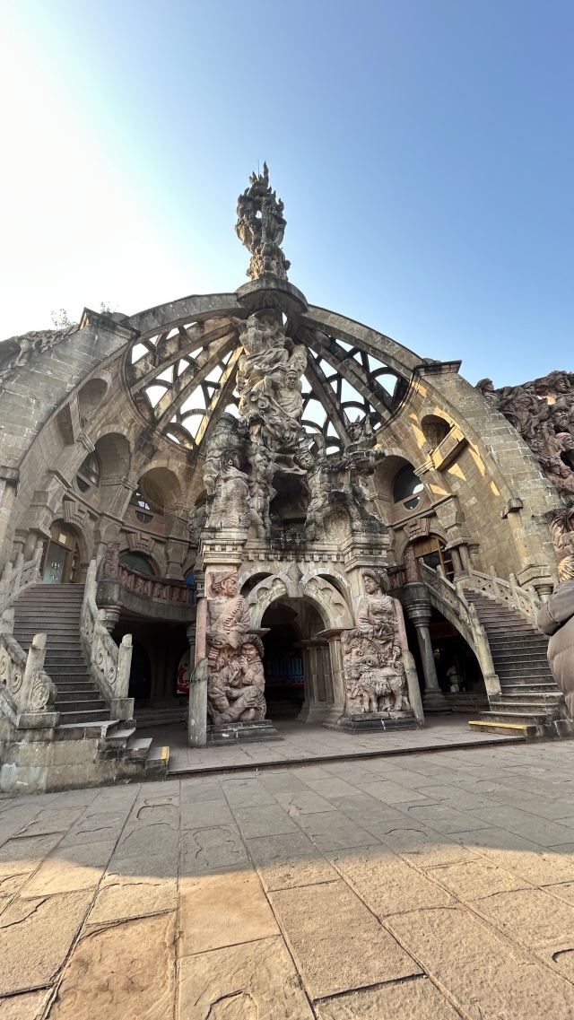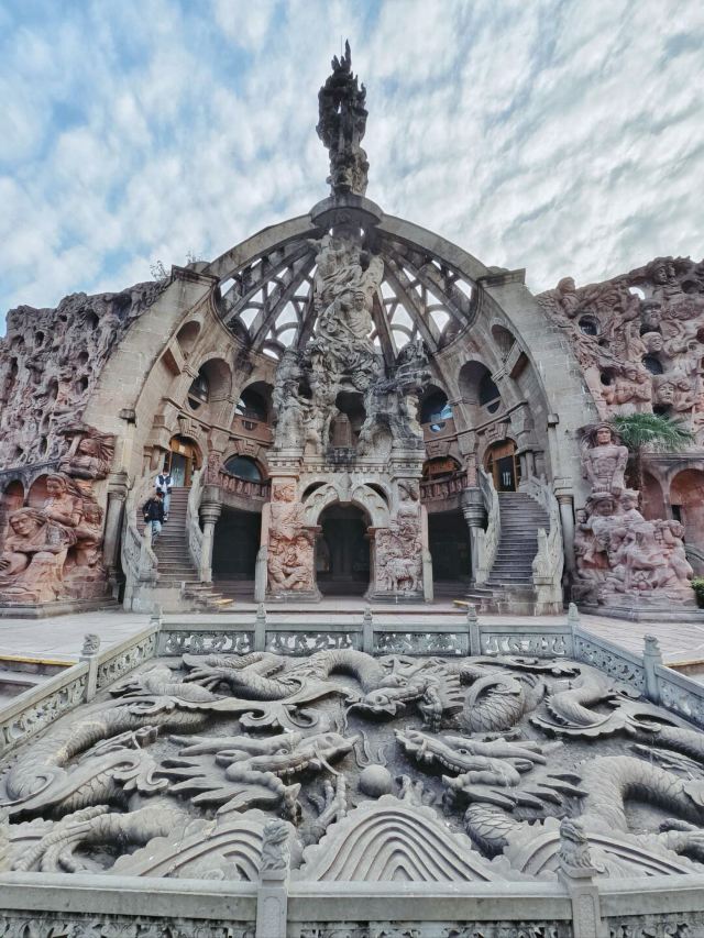 [糖果]2)标志石雕-智慧之光。在石刻群中心位置,半球状的碗里镂空雕塑了一座小塔,左右是西斯廷建筑风格的半环廊道,整体表现带有拜占庭建筑的特征,又兼具哥特式、洛可可的味道,我简直都不知道我在说什么了,反正就是比较壮观,适合拍照。它的对面还雕塑了一个时空之门一样的带环拱桥,桥上又有以后母戊鼎为模板的石鼎,中西结合的如此不失微笑,也算是奇景了。