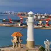 “登洲一望千帆过,巨轮进出吾点航。”站在灯塔顶部,放眼望去,风能机排、边贸城、八所港、工业园区以及北部湾东方滨海风光一览无余。