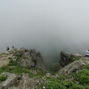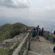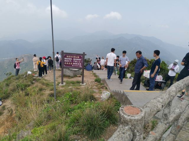 再说山, 一直沿着山路走,就到主峰入口。登山步道是石级,山脚的路比较平,越往上走越陡峭,当接近峰顶时,树渐渐变少,露出微红的岩石。峰顶上筑了一个平台,平台要由一条云梯爬上,云梯上半部分很多是从大岩石上凿出来的,爬时在石头间穿来穿去,云雾一阵一阵向我们飘来,一些往山顶飘去,一些在石缝间穿过,这里才是最险峻的地方。登上平台,啊!东莞郊区景色尽收眼底,真是“无限风光在险峰”。