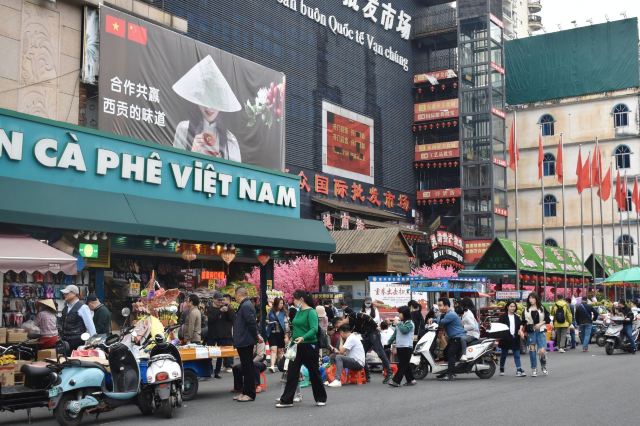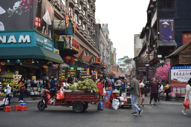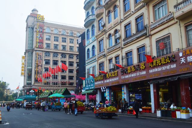 街道两侧房屋上都插着五星红旗,其中有许多商铺都售卖着越国特产,也有许多越南人在摆着摊卖着越南的小吃与传统特色商品。
