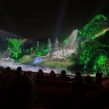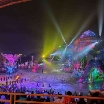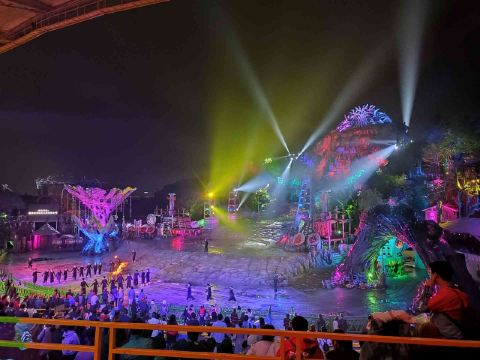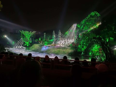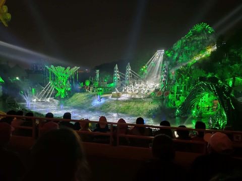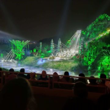 接下来就是晚上游玩的重头戏,观看《暴雨山洪》,每天演出时间都不同,基本上都是从晚上7点开始,演出时间半小时到1小时不等。记得在园区入口就去领取你要看的演出票,因为游客众多,如果不及时拿票,临时去非常有可能看不到。另外,如果碰到节假日人多的时候还会加场,一定要在入园时就了解清楚自己要看的场次,免得错过表演。