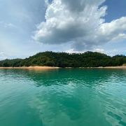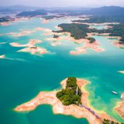 微信小程序万绿湖风景区,又名新丰江水库,与西双版纳、鼎湖山被人并称为地球北回归线“沙漠腰带上的东三奇”,被誉为“天上瑶池水,人间万绿湖”,主要位于广东省河源市东源县境内,是粤港4000多万人的重要饮用水源地,湖水水质一直保持国家地表水Ⅰ类标准。万绿湖风景区是华南第一湖,因处处是绿,四季皆绿而得名。万绿湖风景区水质常年保持国家一类地表水标准,水域面积370平方公里,蓄水量约139亿立方米,有360多个绿色岛屿。万绿湖风景区一年四季湖水的恒定温度在19℃—23℃,湖区基本不受台风影响,湖面少有风浪;因湖水颜色随着太阳照射角度、光线的不同,在一天时间里产生几种不同颜色,由近到远从墨绿、深绿、浅绿、淡绿逐渐转淡,因此而水色秀美。