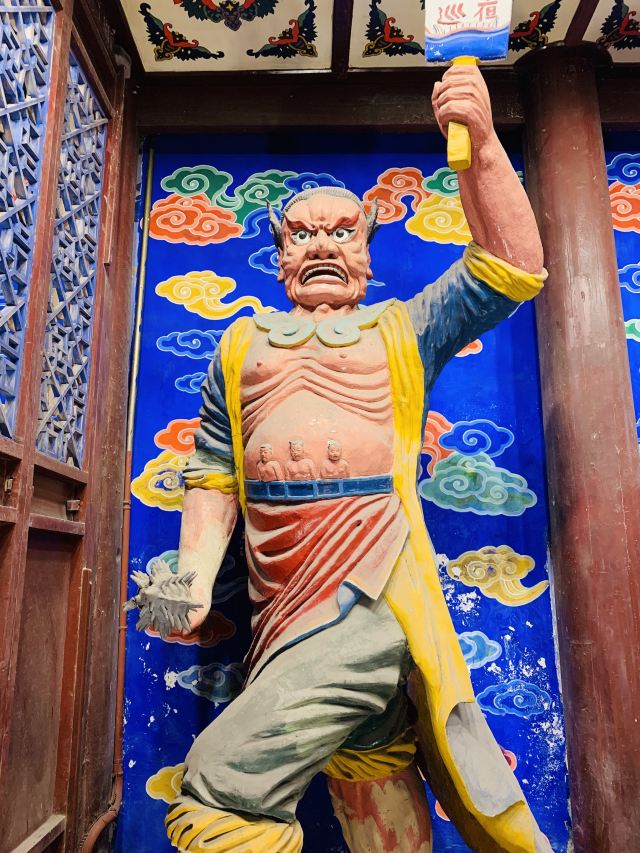 (2)城隍庙。十殿其实算城隍庙的延伸板块,也就是城隍庙也是阴间文化的组成,这是我隔了很久才意识到的,以前只认为城隍是祭拜土地和城市保护神之类的,实则城隍是人死后,进入阴间前的引路人,根据地府文化制度的规章要求,人到阴间需要路引,路引需要盖章才能被允许通行,先是城隍盖章,然后牛头马面拿人,最后阎王盖章,此人才能进入轮回十殿流程,否则就是孤魂野鬼,没得户口。所以,城隍庙一堆阴间人物雕塑,日巡夜巡牛头马面还有各种超度昆虫鱼类野兽的司职官员,难怪有人说白天看会瘆人。