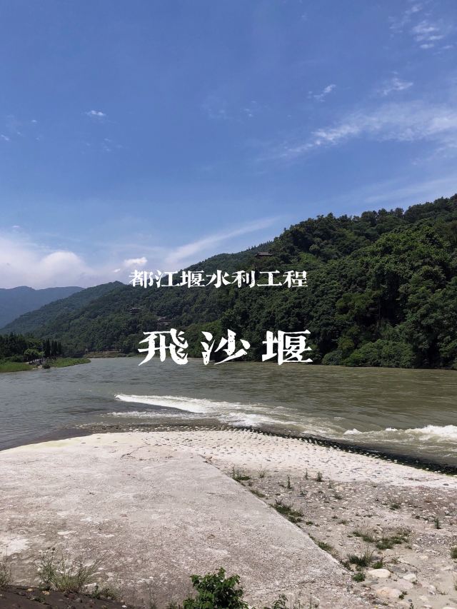 飞沙堰在鱼嘴以下的长堤,虽然看上去很普通,但作用巨大,起到了泄洪排沙的功能,是都江堰水利工程确保成都平原不受水灾的关键要害。在二王庙的那座山上,是俯瞰飞沙堰的好地方。飞沙堰是春、秋、冬、三季是人们往返于离堆公园与索桥之间的行道坦途,洪水季节这里浪花飞溅,是内江的泄洪道。它的主要作用是当内江的水量超过宝瓶口流量上限时,多余的水便从飞沙堰自行溢出;如遇特大洪水的非常情况,它还会自行溃堤,让大量江水回归岷江正流。另一作用是“飞沙“,岷江挟着大量泥沙,石块,如果让它们顺内江而下,就会淤塞宝瓶口和灌区。飞沙堰则将上游带来的泥沙和卵石,和重达千斤的巨石,从这里抛入外江(主要是巧妙地利用离心力作用),确保内江通畅。