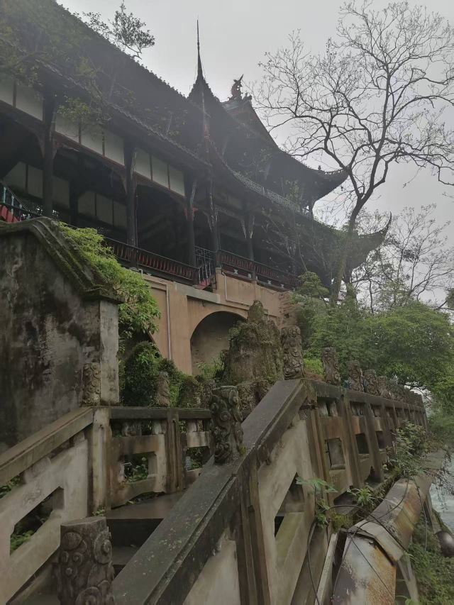 5分 超棒在都江堰景区离堆公园,堰功道北端一座巍峨壮观的建筑就是伏龙观,又名老王庙、李公词、李公庙等,是纪念李冰的庙宇。观因李冰降伏孽龙的传说而得名。传说李冰父子治水时曾制服岷江孽龙,将其锁于离堆下伏龙潭中,后人依此立祠祭祀;北宋初改名伏龙观,始以道士掌管香火。伏龙观原有殿宇两重,清同治间建成李冰殿,共有主殿三重。1959年培修时,将玉皇殿、喜雨楼合并,改建为钢筋混凝土砖木排架。巍峨矗立的伏龙观建在三面悬绝的离堆之上,一面用42级宽三丈一尺五寸石阶和开阔的大坝相连,三重殿宇顺山势逐级升高,显得特别雄伟庄严。我们计划从游览鱼嘴回来时在拜谒伏龙观,但因时间关系,留下遗憾。伏龙观曾在08年汶川"5.12"大地震中受到重创。当时的震波穿越龙门山断裂带,伏龙观因此被震得瓦砾飞溅,梁柱移位,身型歪斜。后来经过重新修建,才恢复了伏龙观旧貌。