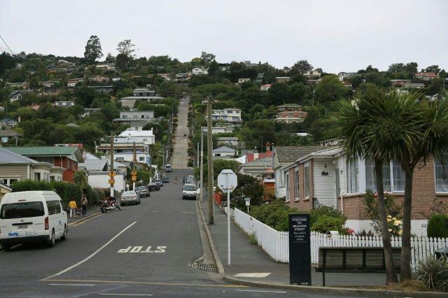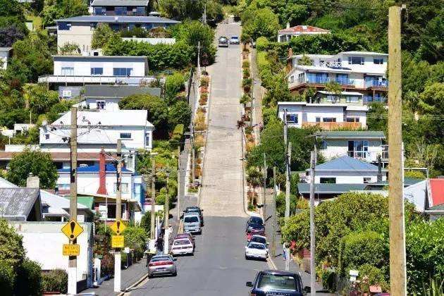 但尼丁的鲍德温大街,坡度为35%,是世界上较陡峭的有人居住的街道。走在这条长度约350米的街道上,平均每走2.86米,高度就提升1米,“爬”到路的尽头,感觉犹如在登山。