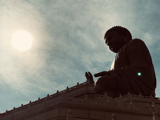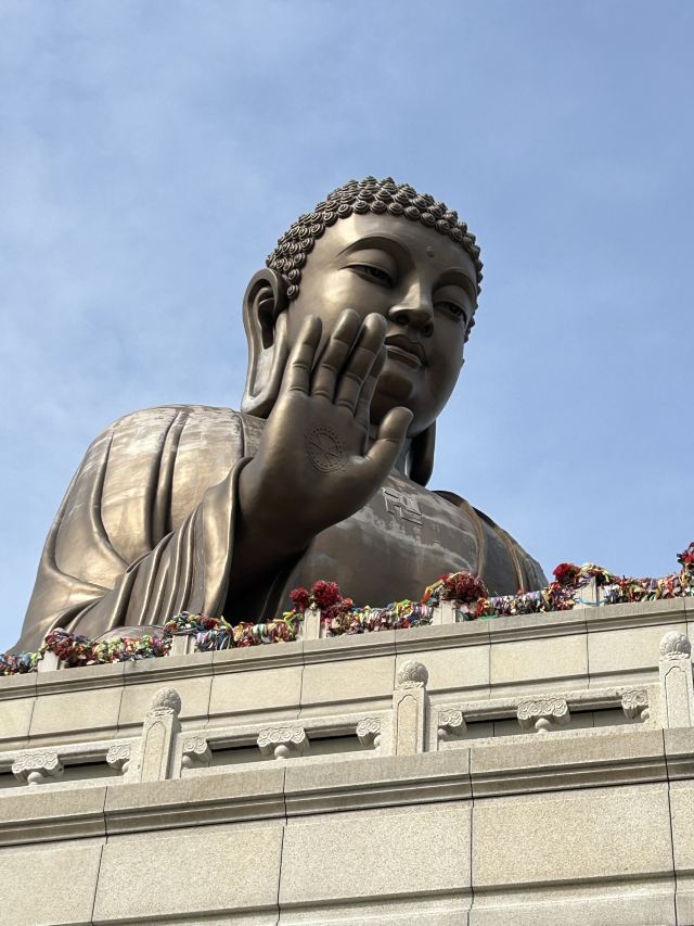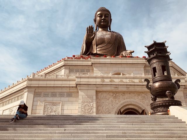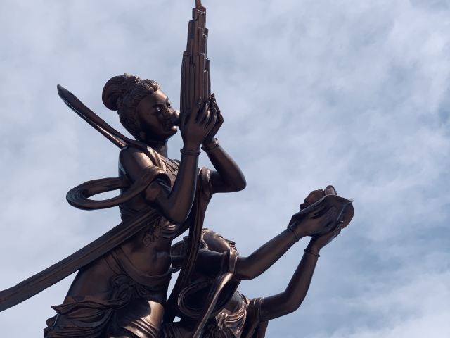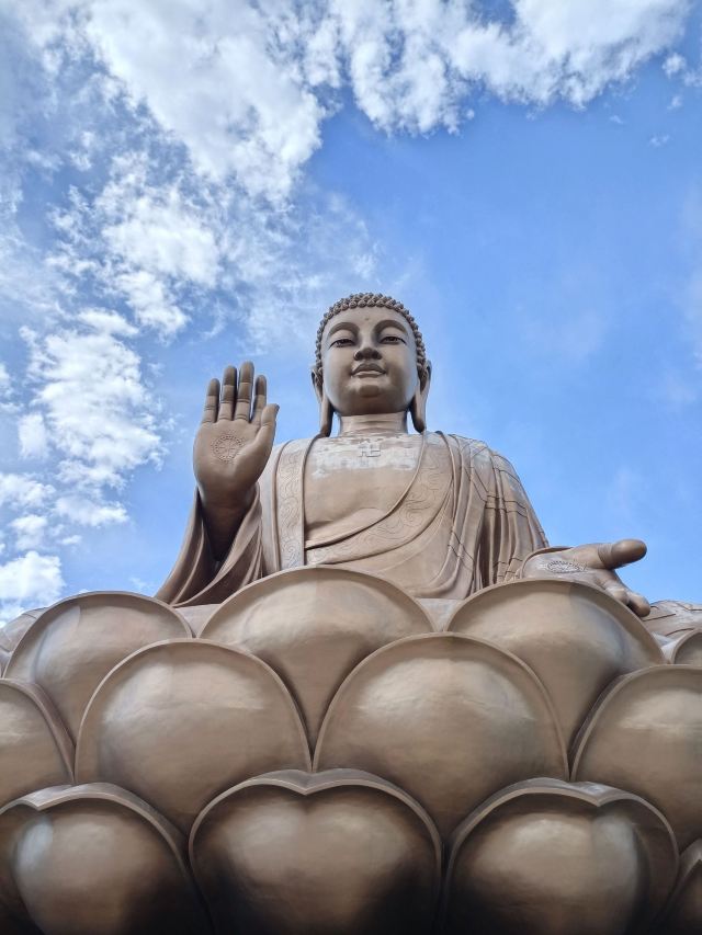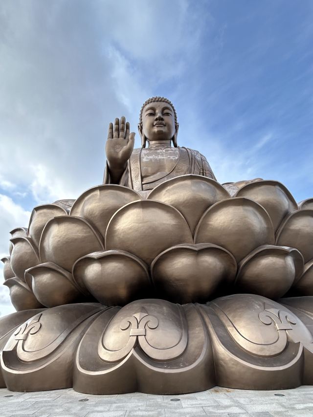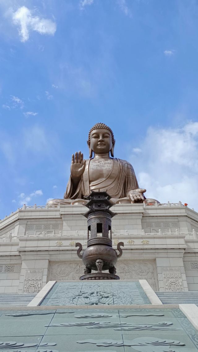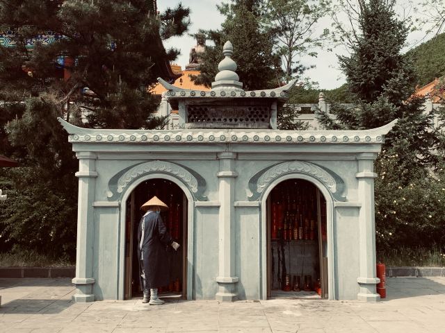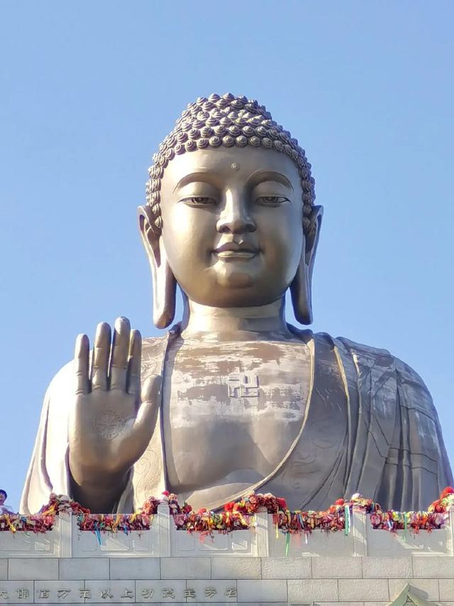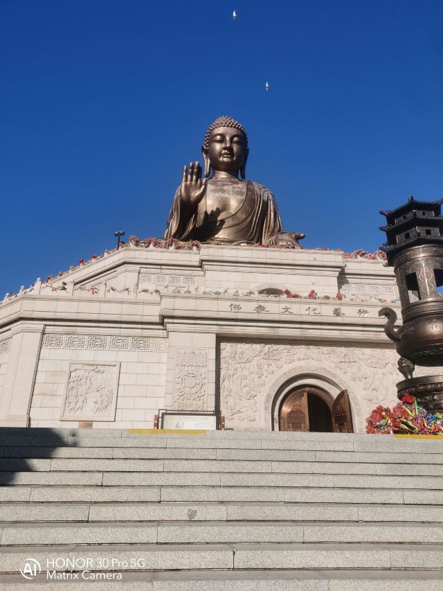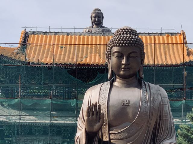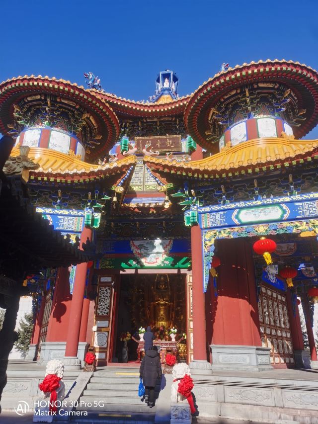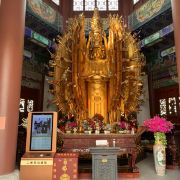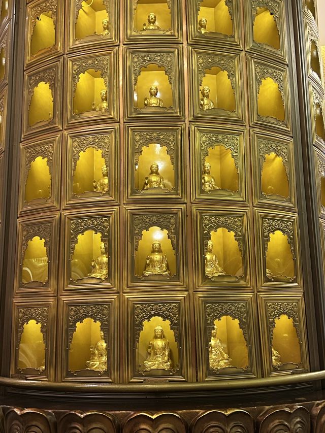 走进寺庙牌门是法音广场,中轴线上依次是山门殿、大雄宝殿、观音殿等五座双檐大殿,随山势逐渐升高。其中,大雄宝殿高居于饰有九龙墨石雕御道的三层围栏月台之上,殿内三尊樟木大佛,以及释迦牟尼成道的陶瓷壁面、八根汉白玉盘龙柱、青皮木雕隔扇门、华贵的藻井均属庙宇建筑之精品。观音殿也是别具特色,殿中纯金贴面的六面体六千只手眼观音圣像,堪称艺术佳作。