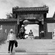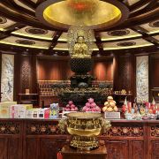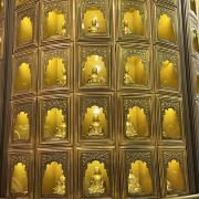 游览后回到寺庙牌门,往左可到玉佛苑,玉佛苑位于一个自然天成的圆形山坳中,为三层亭塔式建筑。一层为玉佛殿,殿内供奉着释迦牟尼涅槃卧相,由一整块缅玉精雕而成,惟妙惟肖。在卧佛头、背、足三侧立有两米余高缅玉十大弟子立像。二层为万佛阁,可以看到一立体“卍”字造型呈360度圆形的万佛城,城内建有一万零八十个佛龛,供奉一万零八十尊缅玉坐佛。顶层为舍利塔,作供奉佛门舍利之用。