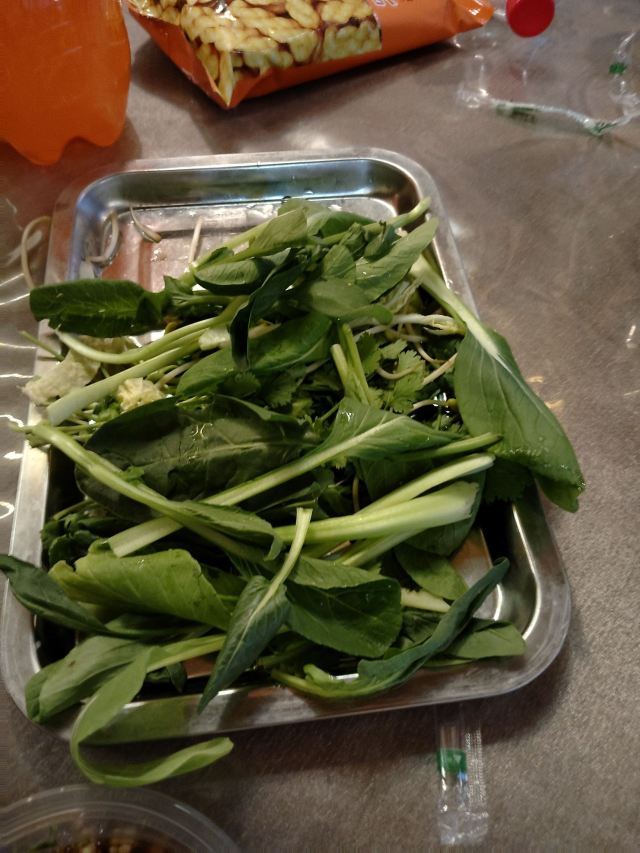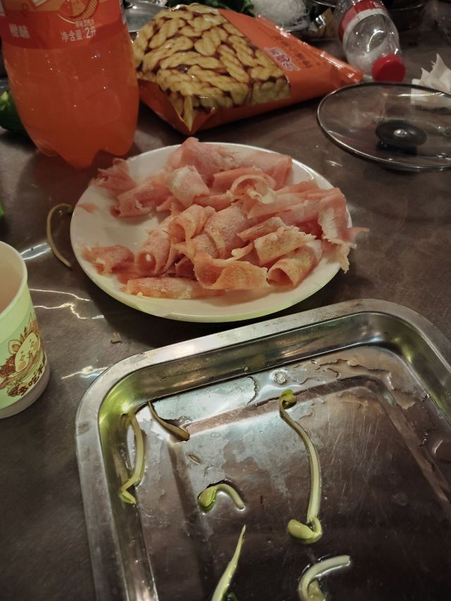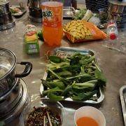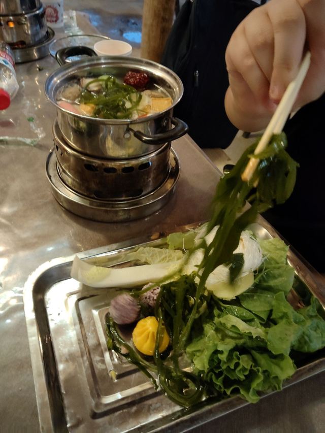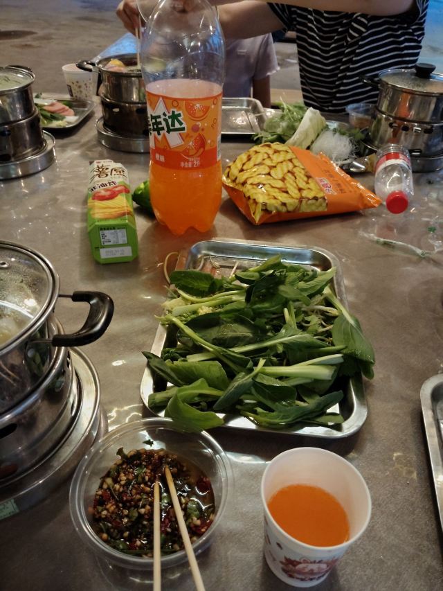 吃的小火锅,蔬菜还是可以的,肉类基本冷冻,好不容易煮熟(小火锅火很小),22点左右才陆续煮熟,尝了几个,肉的味道跟平时吃的不太一样,不敢尝试。好不容易吃完,还剩点芬达饮料(一桌就免费提供一瓶,吃火锅我们还没喝完,你想想这菜的味道),老板也没让带走,坚持规矩就是规矩,不许带走,表示理解最后留给老板了。