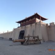 微信小程序敦煌影视古城又称敦煌影视城、敦煌古城,位于敦煌市区西南侧,距离市区车程约16公里,是游客游玩敦煌西线上的一处重要景点,一般和玉门关、阳关景区、敦煌雅丹国家地质公园一起一日游玩。影视古城是1987年中日合拍历史故事片《敦煌》时仿造宋朝沙州古城建设,后来又成为《封神演义》、《新龙门客栈》、《奔跑吧兄弟》等众多影视剧和综艺节目的取景地。游客可以来此欣赏西北风情的古式建筑、街道,拍摄古风的照片,也可以细心寻找,发现众多节目中熟悉的场景。敦煌古城的面积不大,长宽大约都有几百米,进入后步行游览即可。一般步行走一圈下来大约1小时即可走完,而且这里并不像其他古城那样有很多店铺可逛,主要都是用来拍影视剧的屋舍,游玩内容比较单调,所以很多游客来此会比较失望。但是如果细心观察,敦煌古城也有很多值得注意的特色。首先便是古城内街道的建筑特色,敦煌古城目前主要有敦煌街、高昌街、甘州街、兴庆街、汴梁街五条街道,每条街道的建筑风格都代表一个地区,走在其中便可寻找地域穿梭的神奇感觉。敦煌街是参考了莫高窟中西部古城的壁画建造的,也是古城内繁华的街道,在这里可以看到纯正的敦煌古老街道的样子。高昌街则是仿造新疆吐鲁番的古建筑风格,可以看到很多维吾尔族风情的土坯方形房子,极具新疆特色。甘州街是模仿古甘州城(即现在的张掖),可以看到街上很多的茶棚等,体会河西走廊上绿洲驿站的特色。兴庆街的兴庆则是代表着银川,这里以西夏风情的建筑为主。后一条汴梁街是仿造宋朝时汴梁的街道设计,也是古城内一座中原风情的街道。五条街道各不相同,逛起来非常有特色。体会几条街道不同风情的同时,也要留心观察一下几处特别的建筑,这些建筑是古城里的亮点,也是很多影视作品中都会出境的场地。例如敦煌街中心处的刺史府便是古城内气派的建筑,也是《跑男》中“老爷审犯人”的场所;九里香是反映酒泉地区酒文化的主要建筑;鸿运客栈则是《张大千——敦煌传奇》中张大千临摹壁画时的居住地,等等。在这些建筑中漫步参观,寻找电视电影中熟悉的场景,也十分有趣。