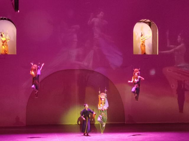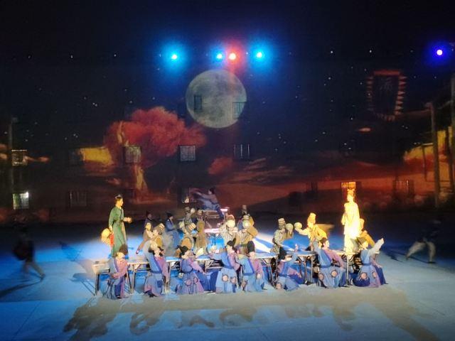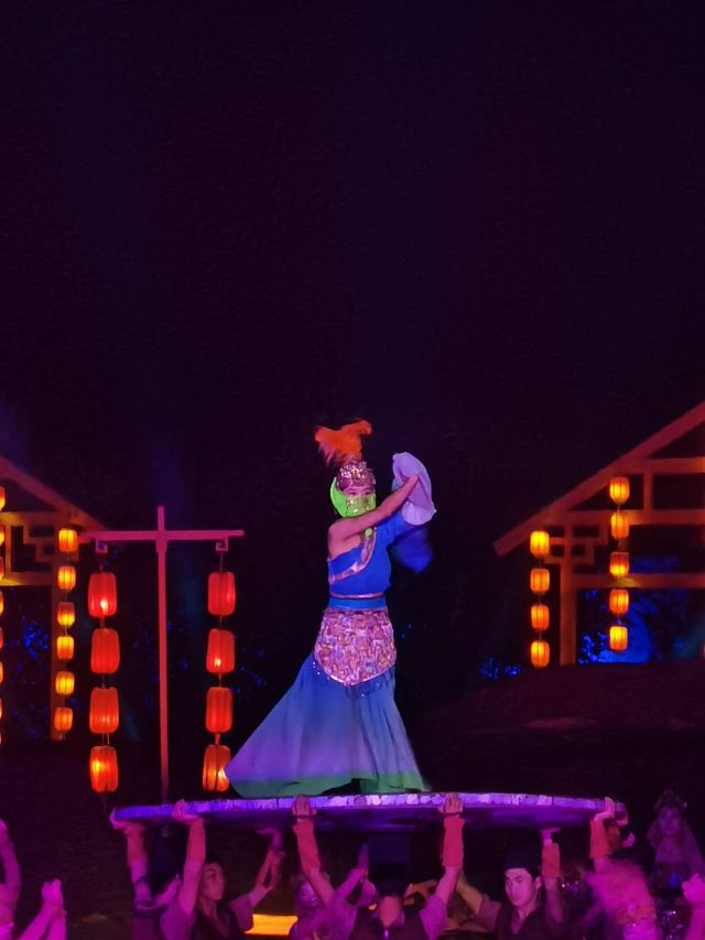 4分 满意敦煌盛典实景表演位于鸣沙山月牙泉旁约1.5公里的敦煌山庄内,订的九点的场没有订的到,买了10:20的B区票,288一张。舞台分四周四个场景,观众席整体是可以旋转移动的,这样可以根据场景向舞台方向转动。总的来说这个故事显得平铺直叙,不是曲折动人,所以只好用舞美,灯光来修饰。个人认为第一,组织混乱,10点20的场,10点10分放人进入,一般来看的都是看完鸣沙山日落直接过来的,排队排的腰疼。在黑乎乎的舞台里找座位实在是难为了,特别是带小朋友的,挤的浑身汗。第二,与观众互动不行,场景不够震撼,比起常州淹城水秀,杭州宋城千古情要差的多。第三,票价过高,连鸣沙山门票一起接近400,不值。