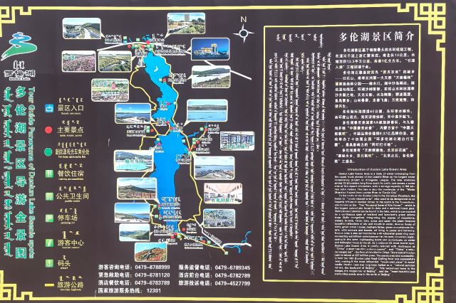 多伦湖景区,前身是锡林郭勒盟草原上规模大的水利枢纽工程——西山湾水库,位于锡林郭勒盟多伦县境内。烟波浩渺的多伦湖,像是一块镶嵌在高山和草原中间的翡翠,山、湖、草原相映成趣。这里夏季温热多雨,秋季凉爽宜人,四季气温变化分明,自然景观丰富多彩,特别适于休闲度假和避暑。这里盛产鲤鱼、鲫鱼等十几种营养丰富的淡水鱼。相传,原来湖内并没有鲤鱼,是康熙皇帝来到这里见偌大水面的湖中无鱼,便叫人用骆驼从黄河驮来数十尾鲤鱼,放养在湖中。至今人们仍把它称为鲤鱼泡子。景区建设了塞外长城、观音洞、厄莫山凉亭等多个景点,景区内有骑马、漂流、划船、游泳、垂钓等多个娱乐项目(娱乐项目需要另外付费),依山傍湖围绕着的还有一条环湖路,路边青草依依,环湖一周,这里的所有美景都会尽收眼底,每年旅游黄金季节,这里举办的全内蒙古环湖自行车赛,更是吸引众多的游客和选手。在景区内,游客还可以体验刺激的水上漂流。北岸码头,是乘船游湖的出发地,可以从这里乘船畅游整个库区。过水凉亭距离北岸码头比较近,水位较高时,凉亭的基座会被水淹没,成为水上凉亭;水位较低时,凉亭会整体显现,成为岛中亭。