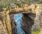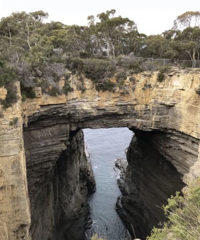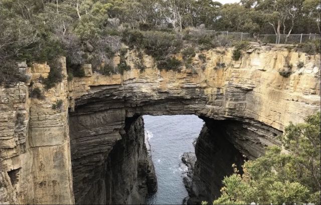 塔斯曼拱门位于澳大利亚塔斯马尼亚州的塔斯曼半岛,是塔斯马尼亚国家公园内的一处知名自然景观。它是由海水长期冲蚀形成的天然石洞,也被称为海蚀洞或海蚀拱门。在数百万年的时间里,潮水不断侵蚀海岸岩石,使其逐渐凹陷,其后被风浪挖穿,形成了如今这座气势雄伟的石造拱门。拱门顶端离海面有 52.7 米高,从这里俯瞰,巨大的桥洞内灌木茂盛,洞壁上呈现出层叠岩的特征,这是海底地壳隆起的有力证明。