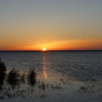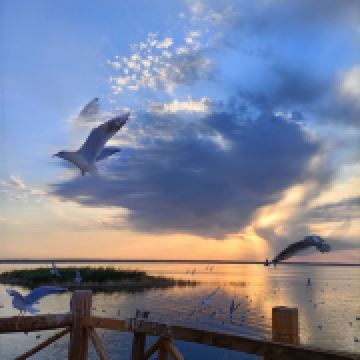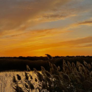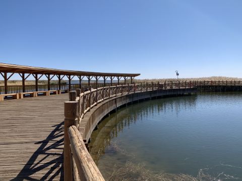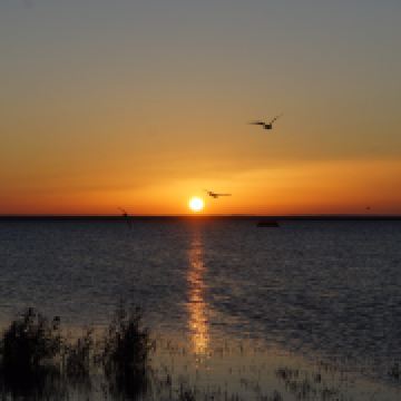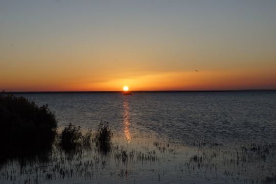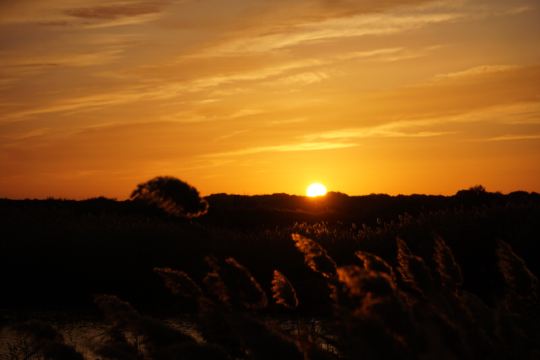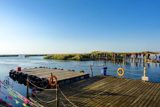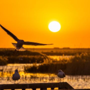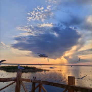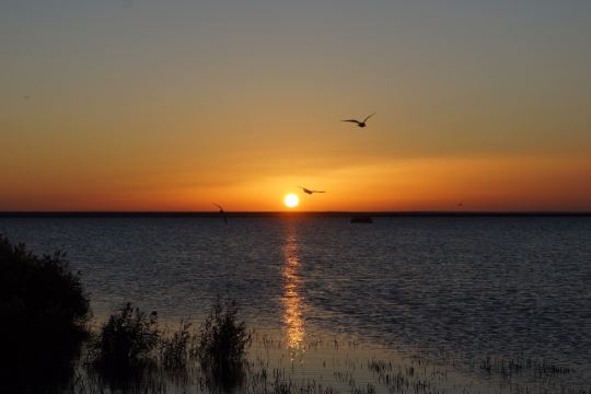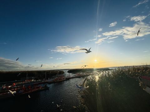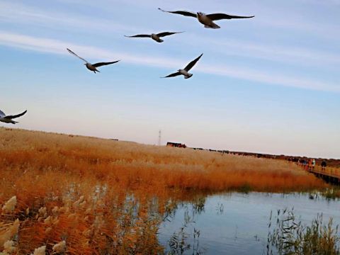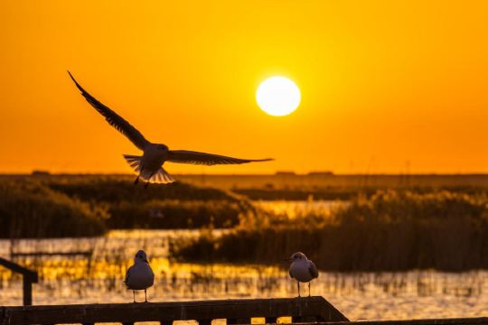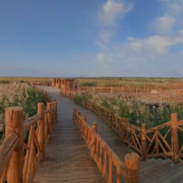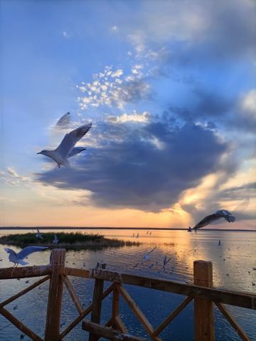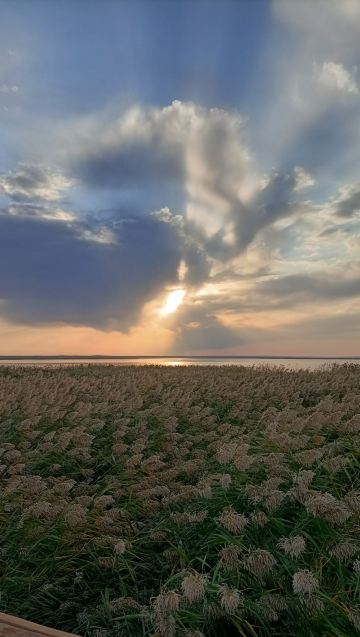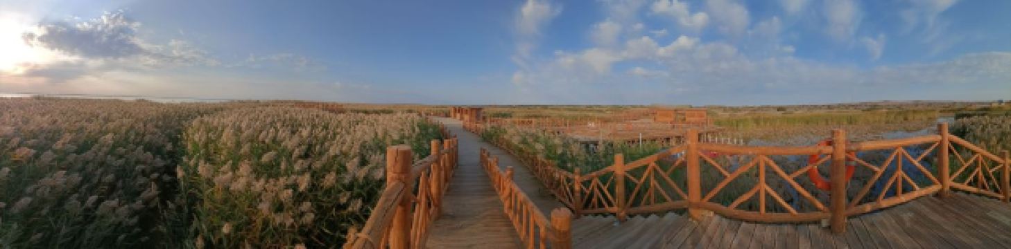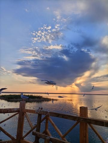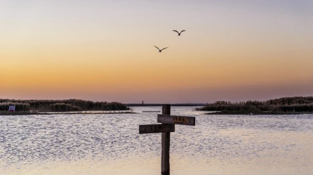 碧波万顷的湖泊、波澜不惊的水面,太阳徐徐升起的场面极为壮观;微微倾斜的湖畔、长长坚实的栈道,构建了最佳观景台;随风摇曳的芦苇、自由翱翔的飞鸟,成为了最佳背景板。