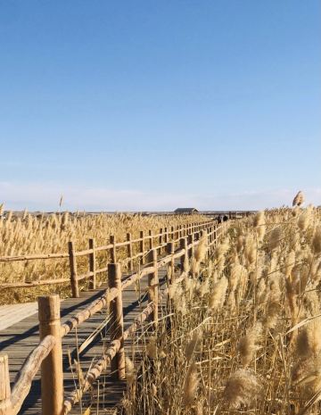 过了码头后,栈道开始穿过高高的芦苇海,走在芦苇中间,前方是蓝天白云,这种感觉真的不错。