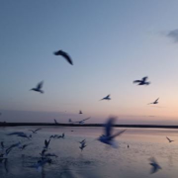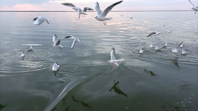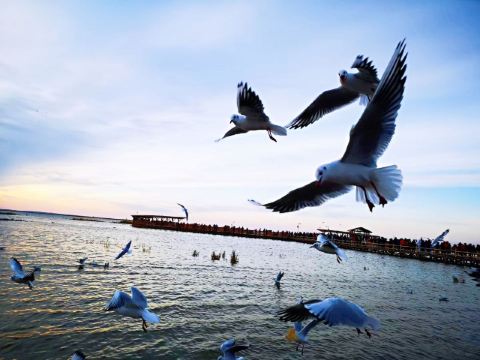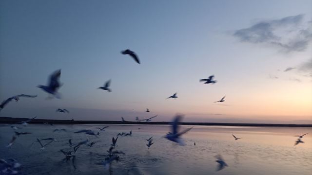我今天是选择了在观光车起点站这里拍日出,这里的优势就是地方比较大,拍出去的景比较平,而且海鸥很多。其实后来我觉得最好的点还是在码头那里,那里的芦苇多,可以拍到很漂亮的日出芦苇海的效果。