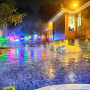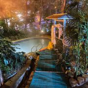 瑜伽温泉水采自峨眉山清音阁两河口地下1652米深处,出水口温度达60℃,水质清澈、无色无味,氡含量达191.66Bp/m³,亿年的积累,千年的流淌,孕育出世所罕见的珍稀温泉。远离城市的喧嚣,抛开工作的烦劳,浸泡在飘散着鲜花和芬芳的温泉里,波光滟潋,心醉神怡,峨眉山的妙曼风姿隐隐可见,树木随着风儿婆娑起舞,心也慢慢地变得空朗起来,闭上眼,静静地享受着这美好的夜晚、温柔的月光,渐渐融入其间,待睁开双眼时,一切的人世浮沉都归真于自然!瑜伽温泉分为室内恒温游泳馆、室外温泉馆两个区域,有游泳池、特色池、功能池、鱼疗池等不同功能的室内外温泉池及私密汤屋共18个池子,可同时容纳600人;室内游泳馆还有专为运动人士增设的健身房。