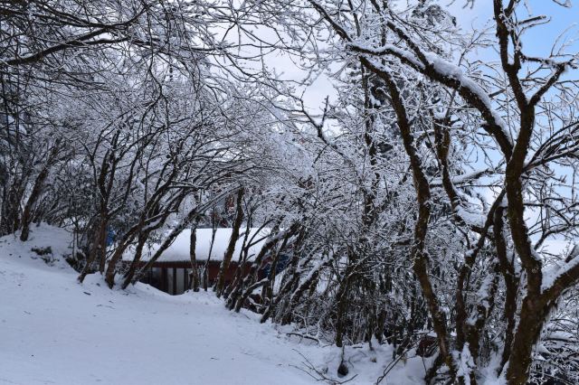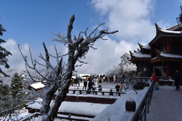 2、坐近2个小时的车到雷洞坪,下车走1.5㎞到接引殿,可以选择步行上金顶2.7㎞(路边标识牌有出入),预计3个小时。要么坐索道上山。遇上下雪的时候路不太好走。