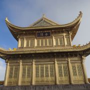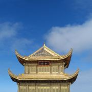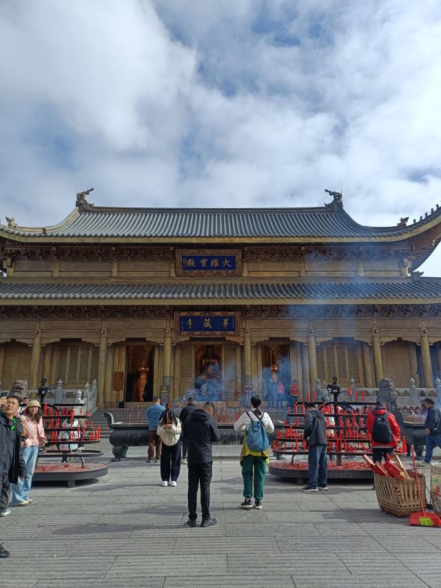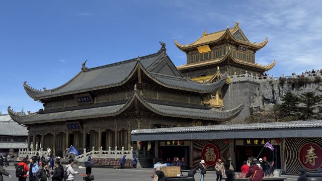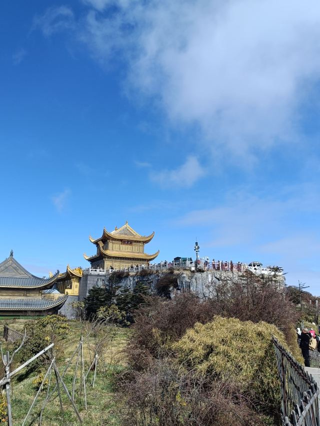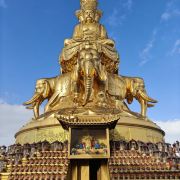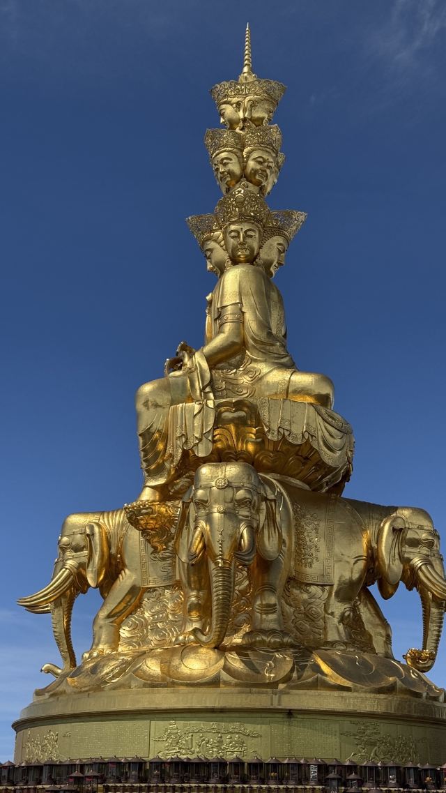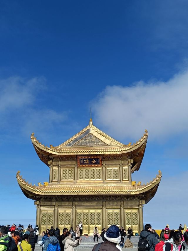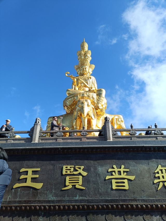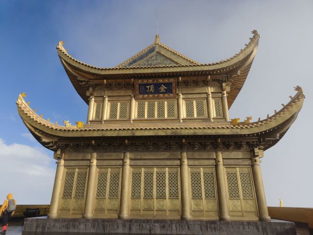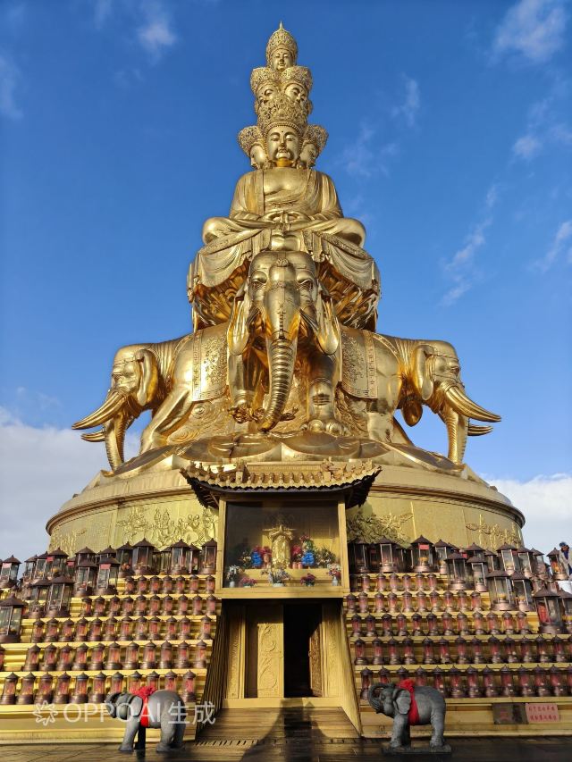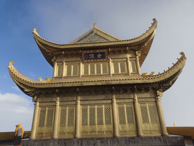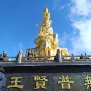 金顶是峨眉山的山顶,金顶上的四面十方普贤菩萨金像,是众多游客来峨眉山的必体验之地。这里海拔3079米,除了高达48米的铜制十方普贤像外,金顶还有一座华严寺,可供祈福。金顶的四面十方普贤金像是世界上较高的金佛,也是普贤菩萨的第一个四面十方艺术造型。普贤菩萨像后边的华严寺有三座大殿,其中的第三殿是普贤殿,也叫金殿或者“金顶”,是峨眉山较高的殿堂,殿门的匾额有“金顶”、“行愿无尽”、“华藏庄严”等牌匾,殿内供奉“普贤骑象”的铜像。