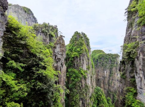 3、途径“土司城堡”(只是几块像城堡的石头)、“石芽迷宫”(石林很有层次感成为天然迷宫,是拍照点)、“悬棺高升”(方形巨石像悬在山上的棺材)、“一线天”(两座山崖之间的石缝,只容一人通行,是拍照点,但拍照时很难不拍到其他人)、“绝壁栈道”(景区精华段,鸟瞰山下墨绿的山峦连绵起伏与蓝天连成一片,心旷神怡,但万丈深渊让人腿发软。头顶有防护网防止落石伤人)和“朝天门”(只是一个拱形小山岩)后到中门楼服务区,物价不贵。