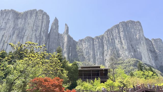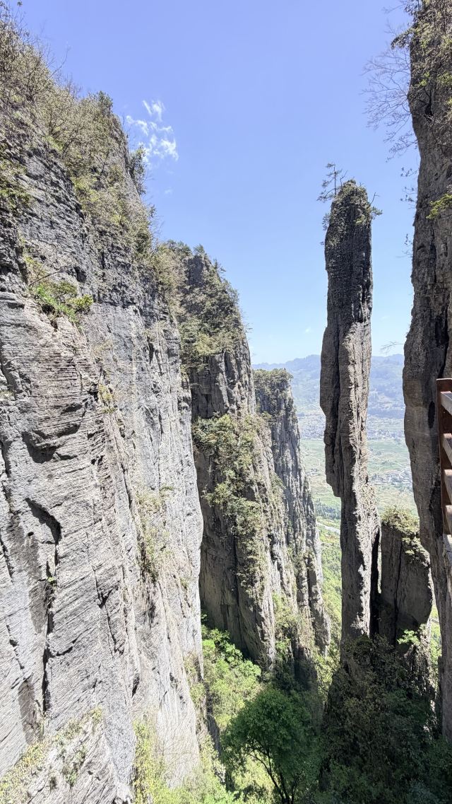 七星寨景区-绝壁栈道,又称步云天栈、绝壁长廊:始建于 2006年8月,历时1年又8个月建成。栈道位于山体东侧的直立悬崖絶壁山腰,海拔约1700余米,全长488米、高差达300米、石阶118个,与山岩绝壁融于一体。因该栈道建于绝壁之上,所以也有人称之为绝壁长廊,或“七星寨景区-绝壁栈道”该工程是巴蜀古栈道制造技术与现代钢筋砼建材、先进施工工艺的结合,科学安全,大气壮观。