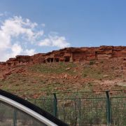 阿尔寨石窟是一座屹立在高原上的红砂岩小山,旁边还有很多石窟,在这里可以看到一望无际的大草原。