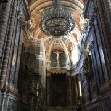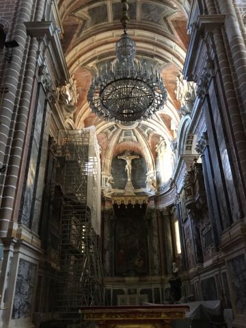 教堂以大理石外观示人,其敦实的结构更像是一座堡垒,一对壮观的不对称钟楼左右加持。教堂正门装点着14世纪雕刻的使徒造型。内部的祭坛和大理石高台更显崇高庄重,穹顶的壁画展现的是阿连特茹令人仰止的神学思想。沿着楼梯直到教堂房顶,可以饱览整个埃武拉老城的风貌。