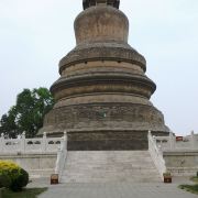 塔身上施曲尺形弥座,座上承刹杆。原有砖制相轮十三层,两层已毁,上覆盖盘,中装金顶宝珠。造型秀美,雄健挺拔,雕艺高超,为我国藏式塔中之佳作。第三层塔心室北壁前并列2尊石雕释迦多宝佛像,佛座上枋刻有贞观二年为太宗皇帝寿诞造像的题记。南门边框上保存着唐代线刻云纹,表面留有宋代游人的题刻。