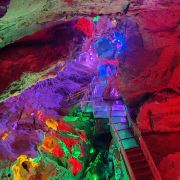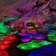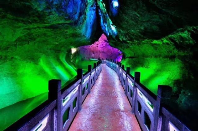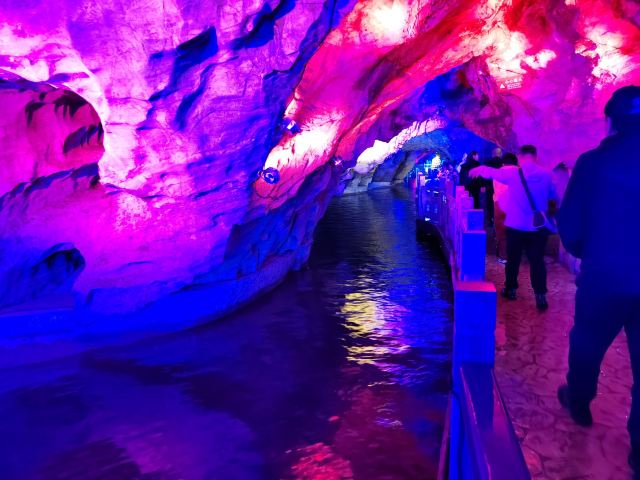5分 超棒进入景区后先走旱洞(青云紫薇仙宫),欣赏各种奇特的钟乳石、天锅石穴等景观,感受青云缭绕的神秘氛围。之后到达玻璃栈道,体验高空漫步的刺激,欣赏洞外的山水风光。最后乘船游览水洞(水月洞天世界),在地下暗河中穿梭,观赏沿途的地下溶洞景观。